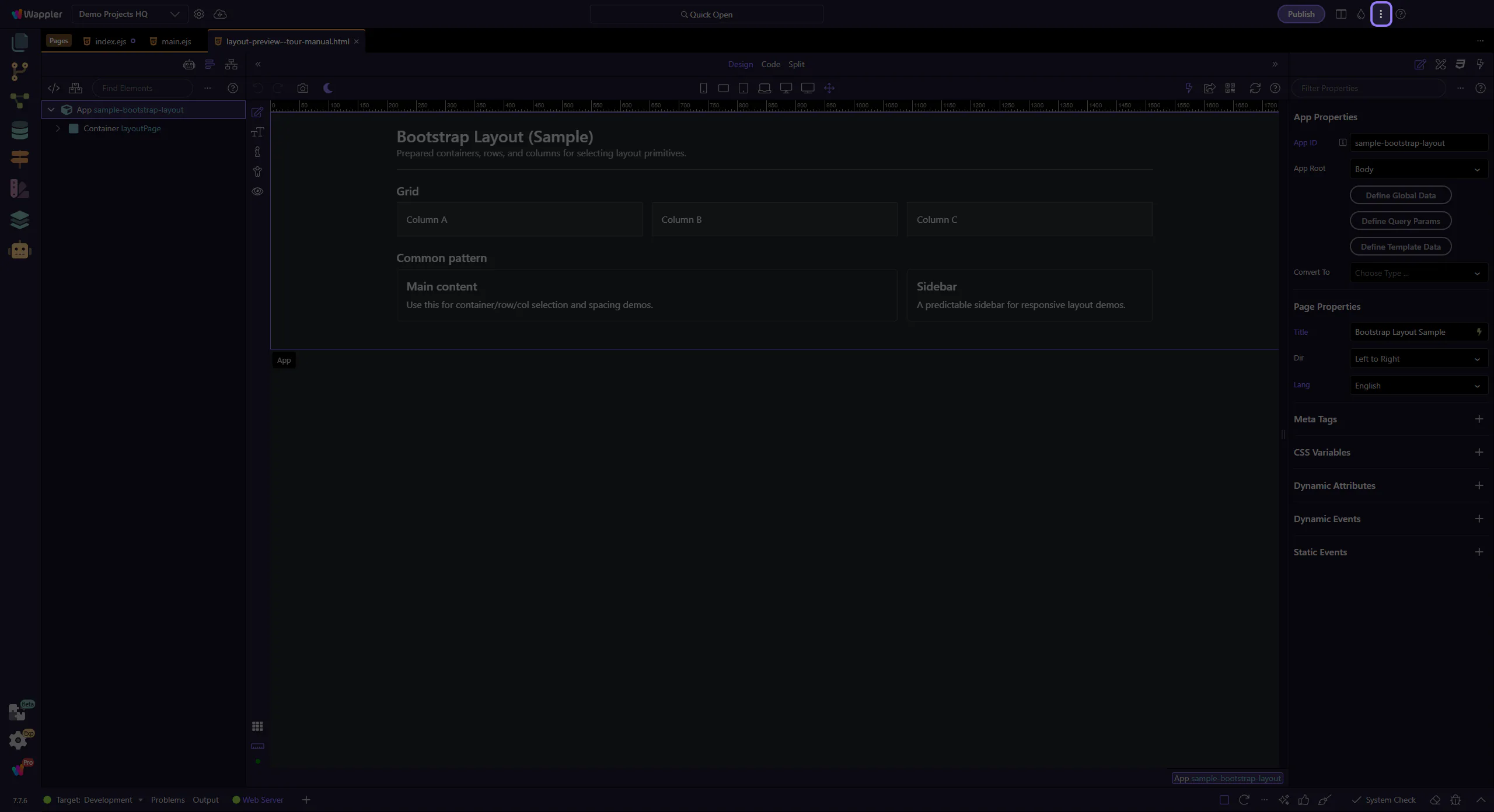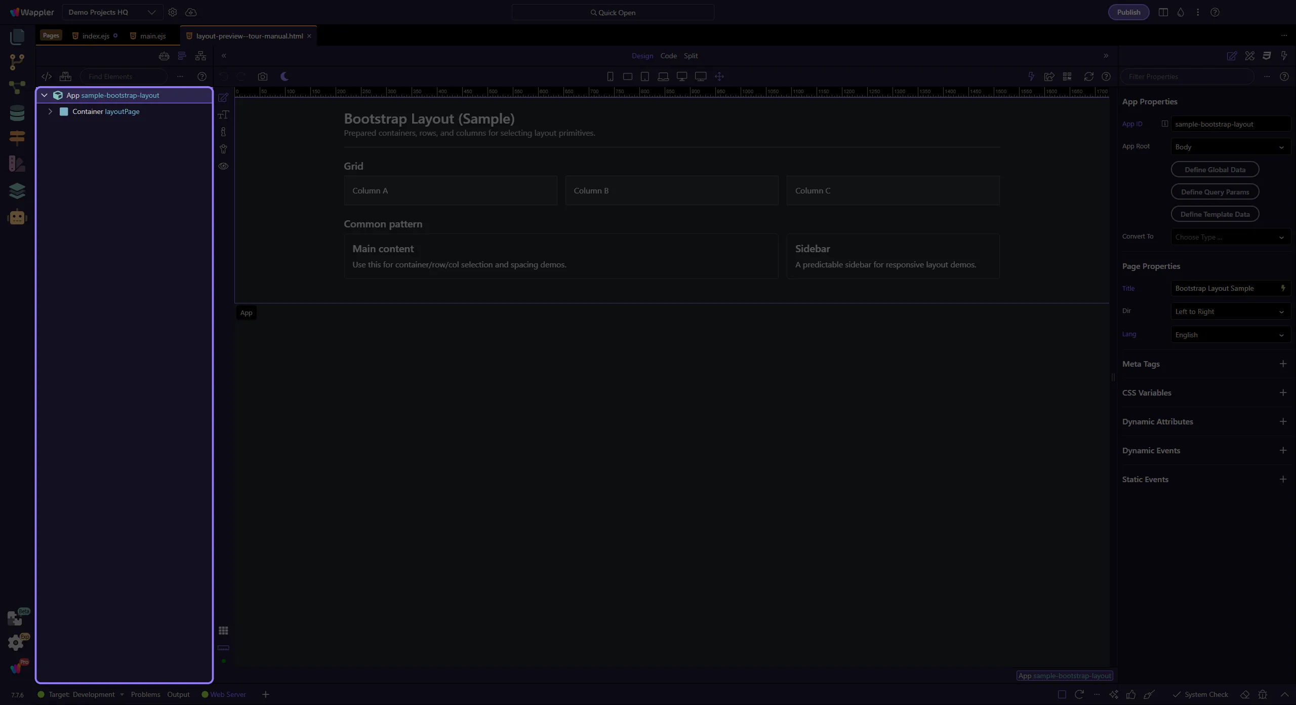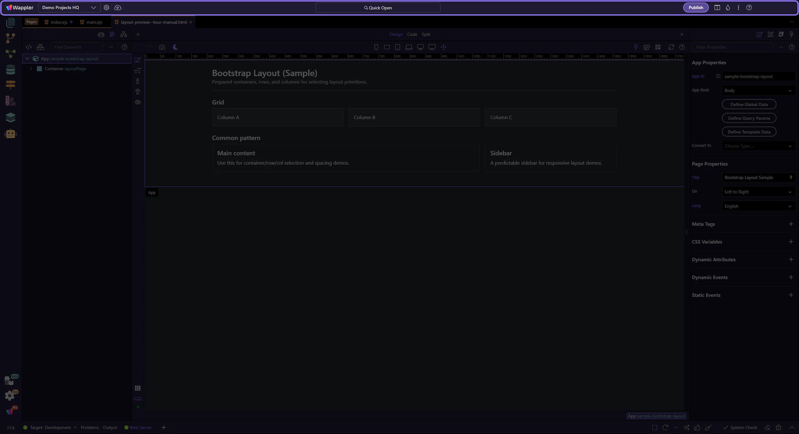 Section titled “Layout example”A layout is loaded so we can focus on how Wappler represents Bootstrap structures.
