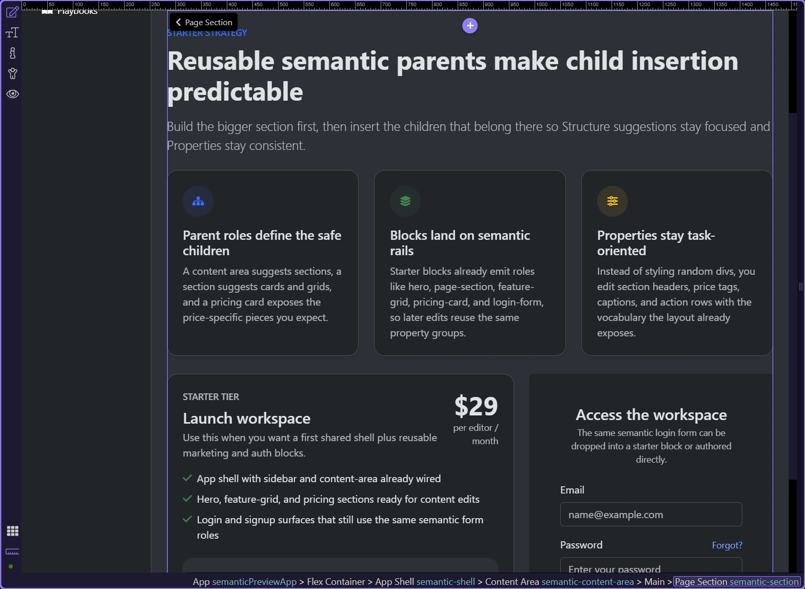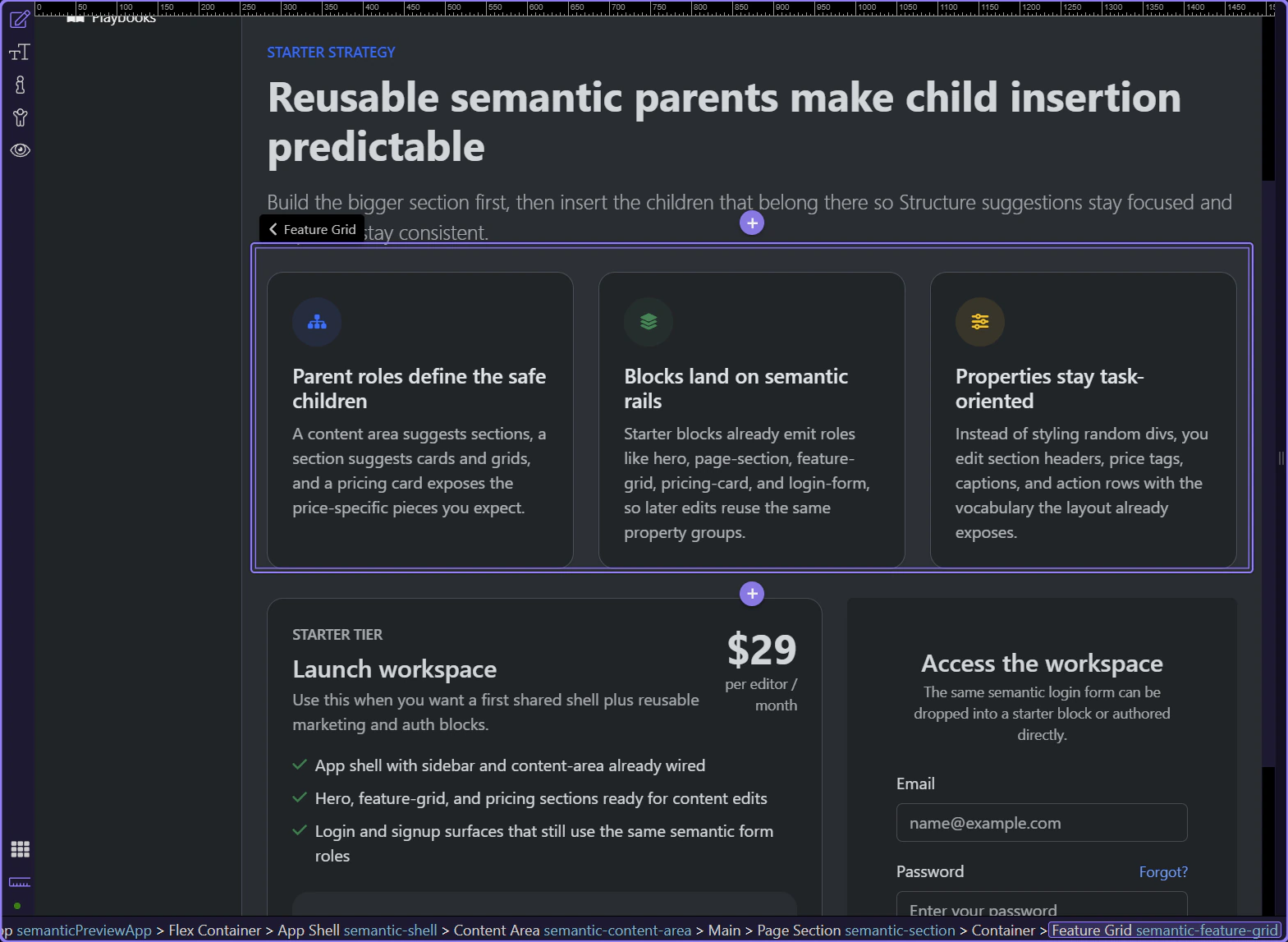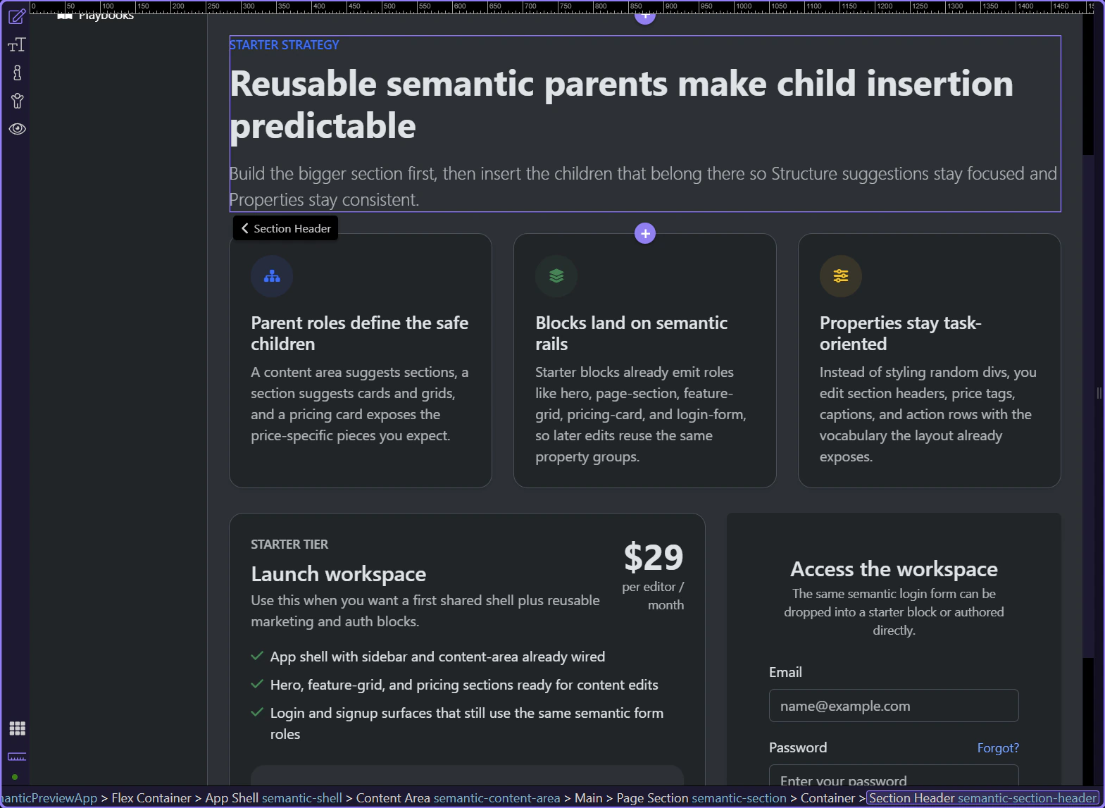 Section titled “What the role system buys you”A semantic page is easier to reason about because each layer carries intent. Shells hold navigation and workspace chrome, content areas hold sections, sections hold cards or grids, and specialized children like price tags or captions keep the property model focused.