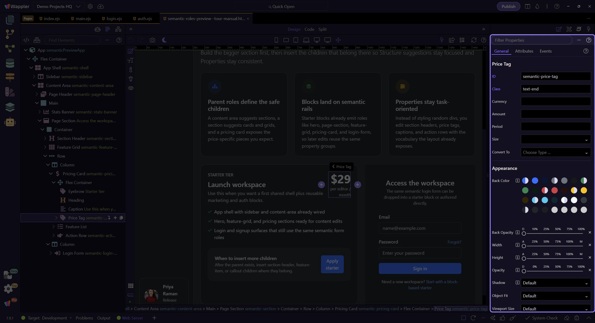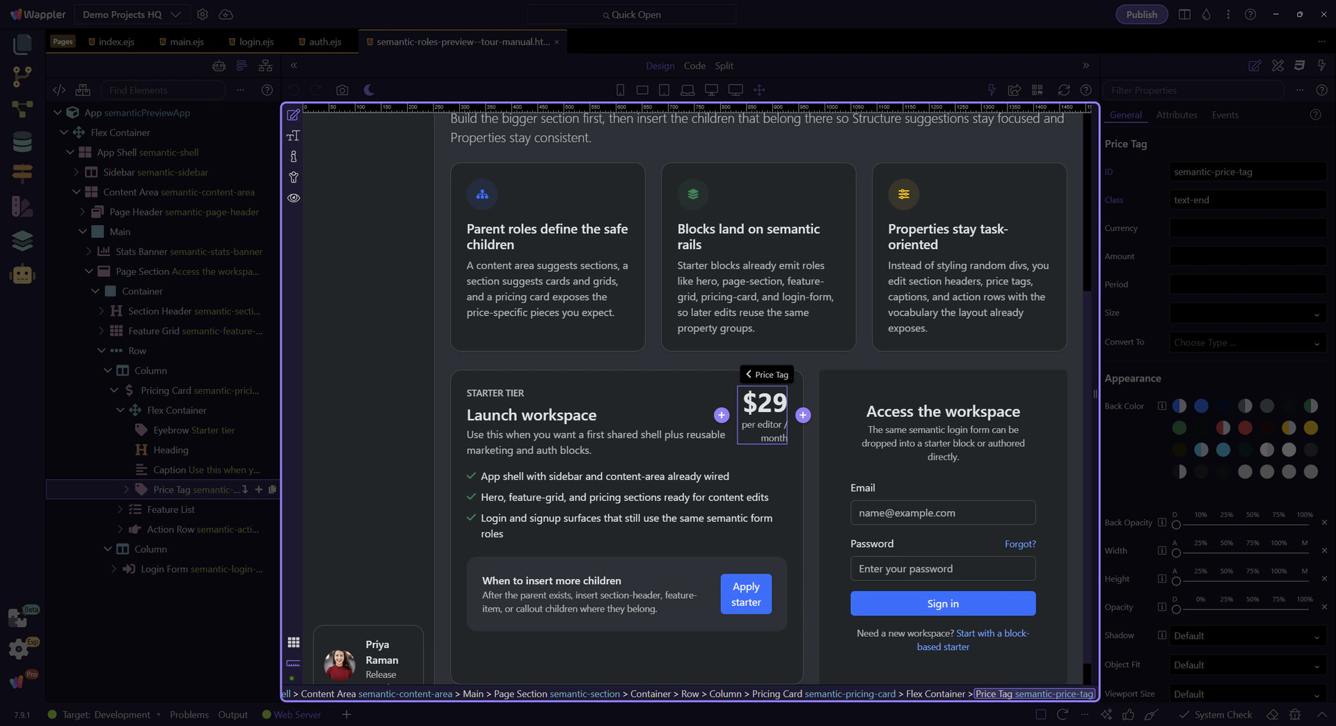 Section titled “Role-specific properties”Selecting a specialized child like a price tag shows why the role system matters: the Properties panel can focus on the thing the element means, not just on raw classes.