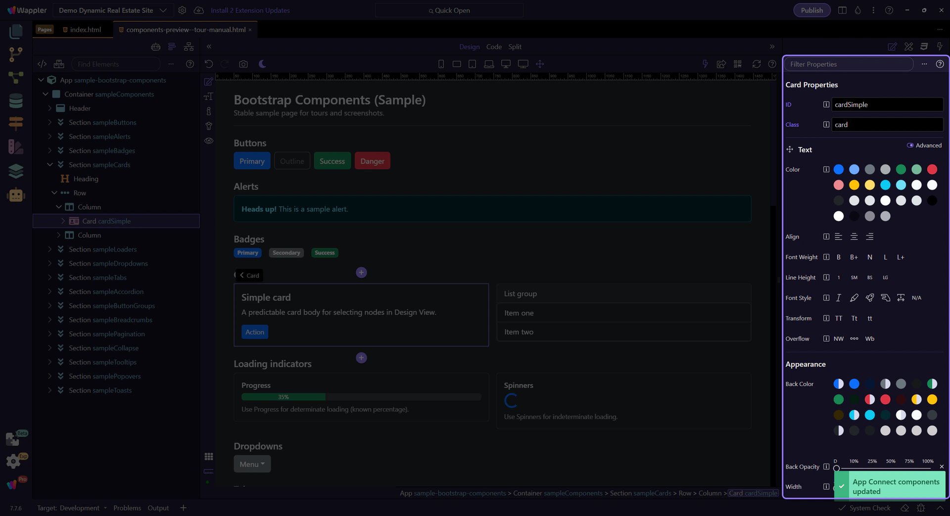 Section titled “Spacing: Margin & Padding”Use Spacing → Margin & Padding to apply Bootstrap spacing classes. This is responsive-aware: when you’re editing a specific device width, Wappler can store the correct breakpoint variant.