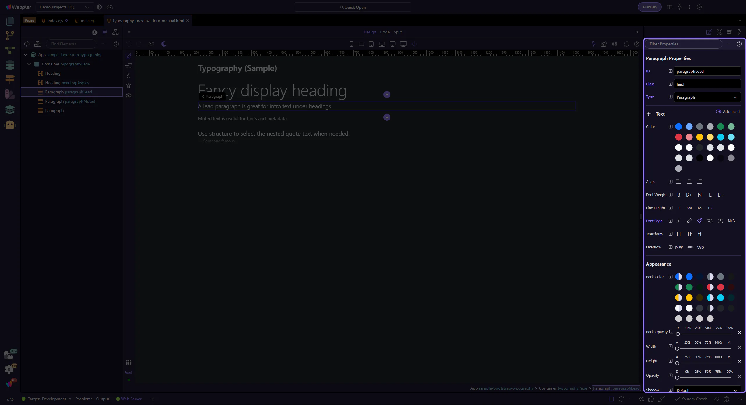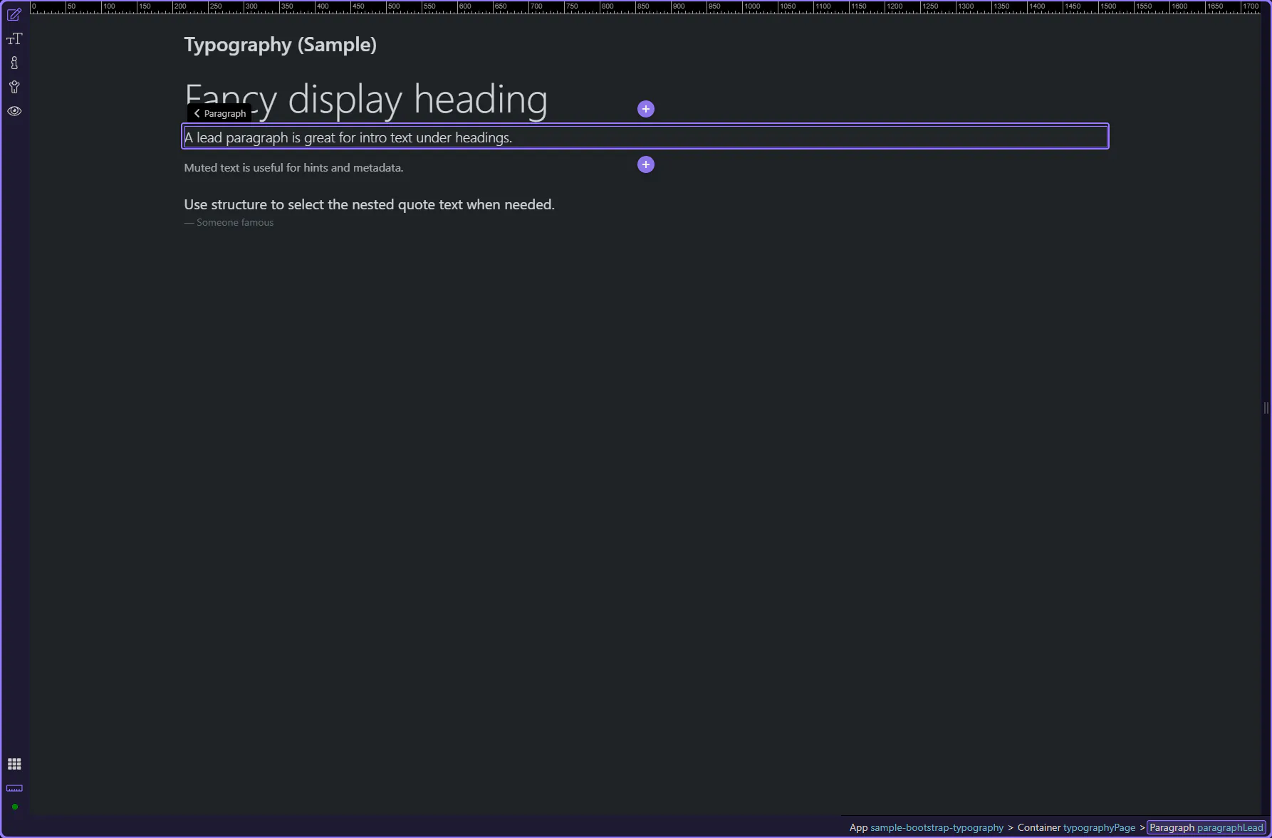 Section titled “Paragraph example”Text utilities help you adjust alignment, wrapping, emphasis, and readability without changing semantics. The lead paragraph is selected so you can immediately see the Text Formatting options. Tip: if selection is tricky, use App Structure to jump to the exact text node.