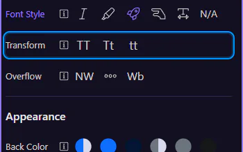 Section titled “Text: Transform”With Advanced enabled, Transform becomes available for uppercase/capitalize/lowercase. This step matters because Text: Transform is part of Selection Panels Properties Texttransform, and understanding that context makes the next action easier to repeat in your own project.