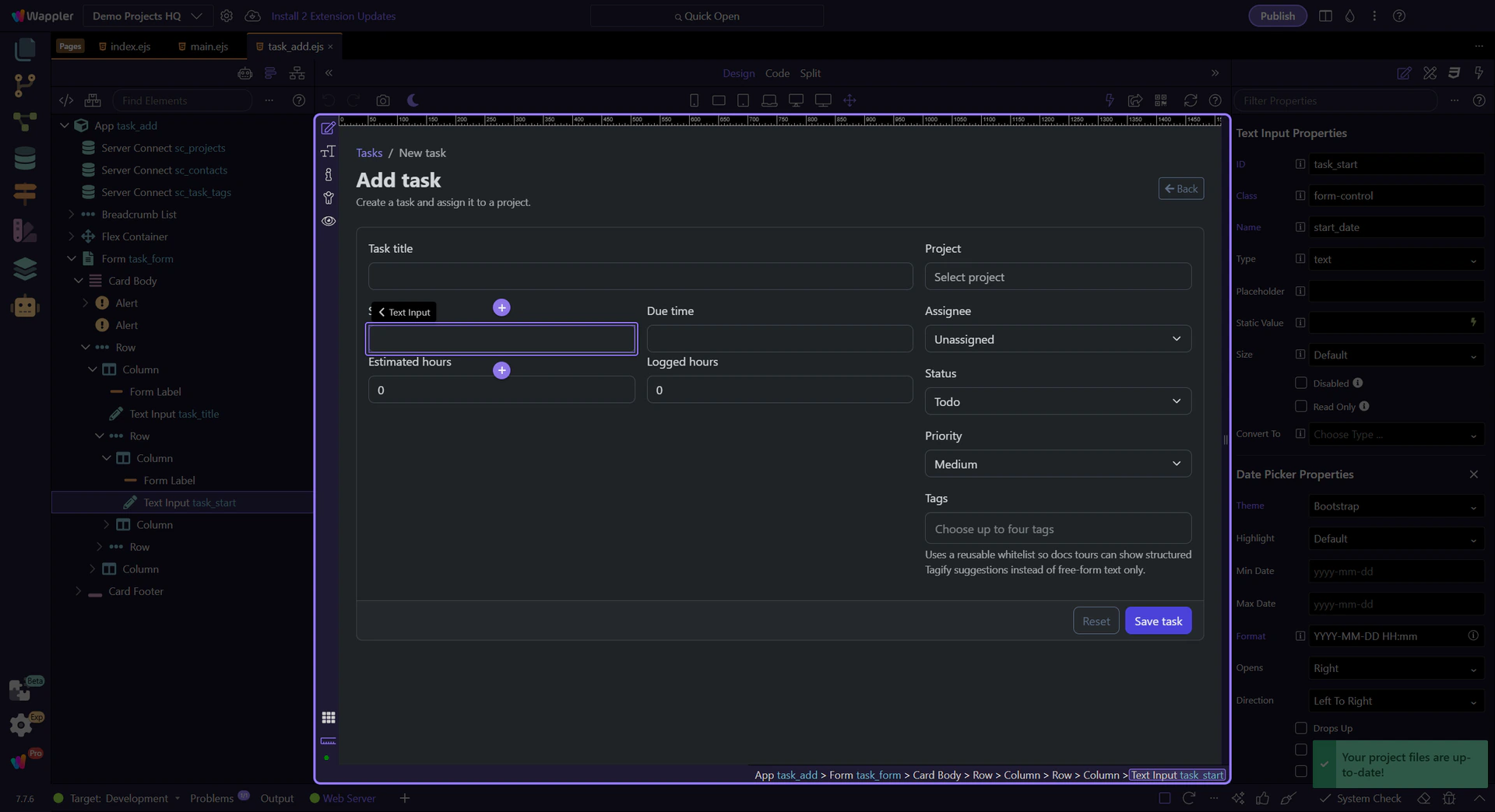 Section titled “Next steps”The Demo Projects HQ task form shows the practical date-time pattern clearly: Design View gives you a familiar form field, the Properties panel explains exactly why the picker behaves the way it does, and the final posted value still flows into normal server-side validation. That is the point of combining date and time in Wappler: one trustworthy schedule value with inspector settings that make the behavior explicit.