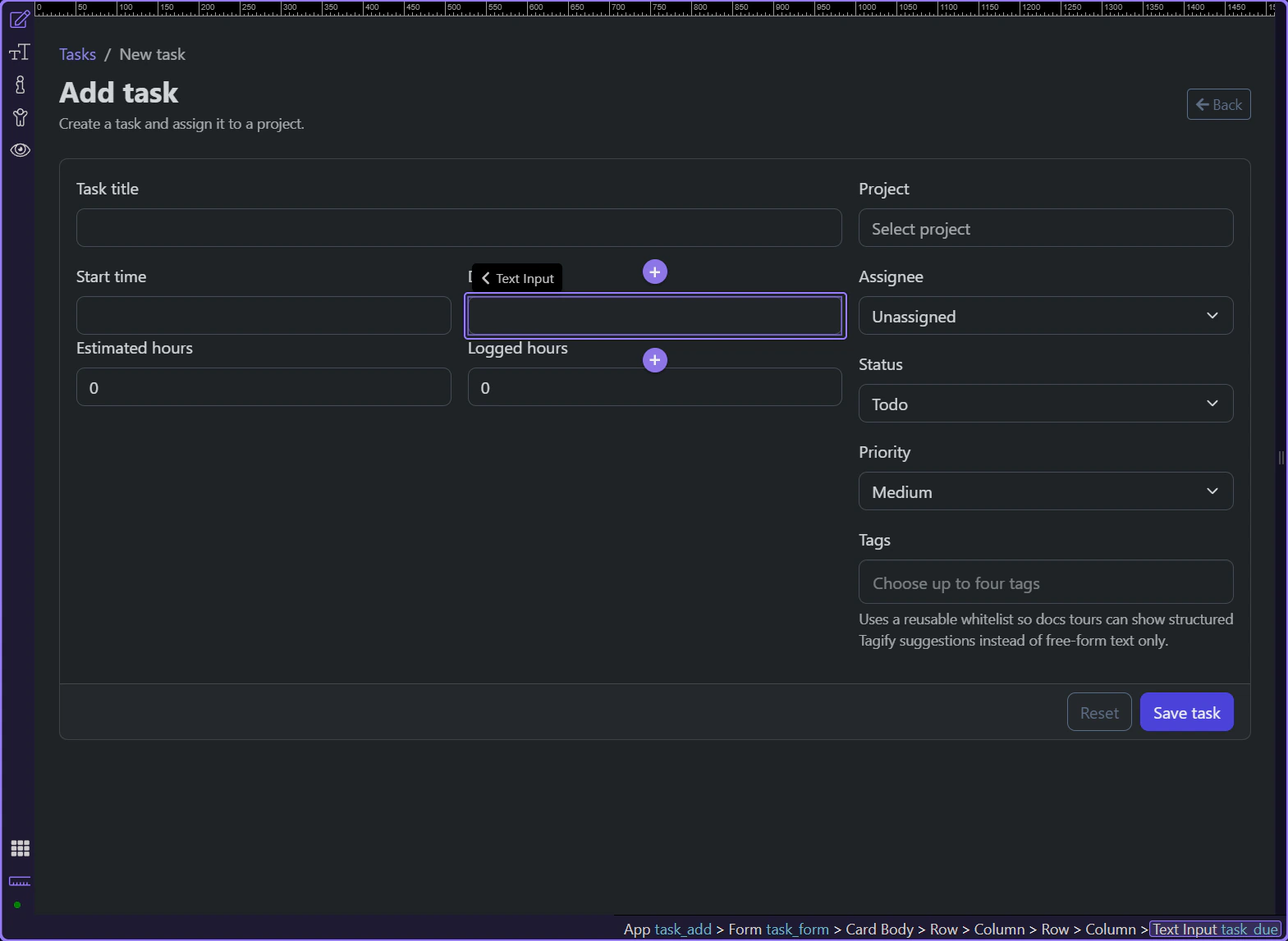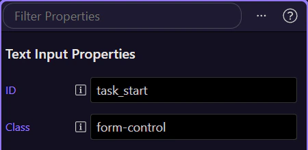 Section titled “Introduction”On the Demo Projects HQ task form, the Start and Due fields use the same date-time picker pattern: one control captures a scheduling moment, while the server later validates the posted value. That makes this a concrete inspector tour rather than a generic date-picker overview. You can select the real field in Design View and then inspect the exact properties that control formatting, time selection, 24-hour behavior, and minute precision.