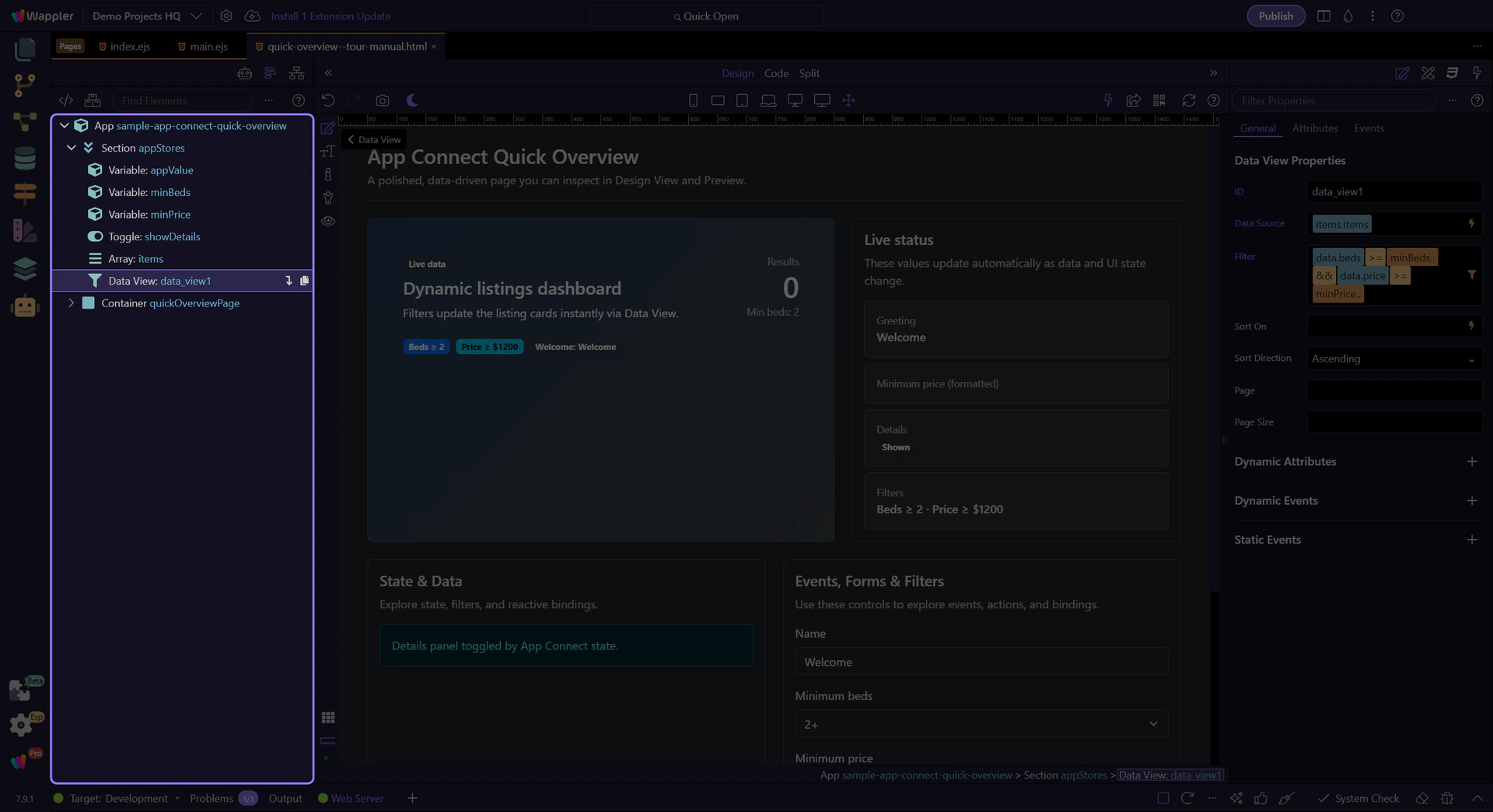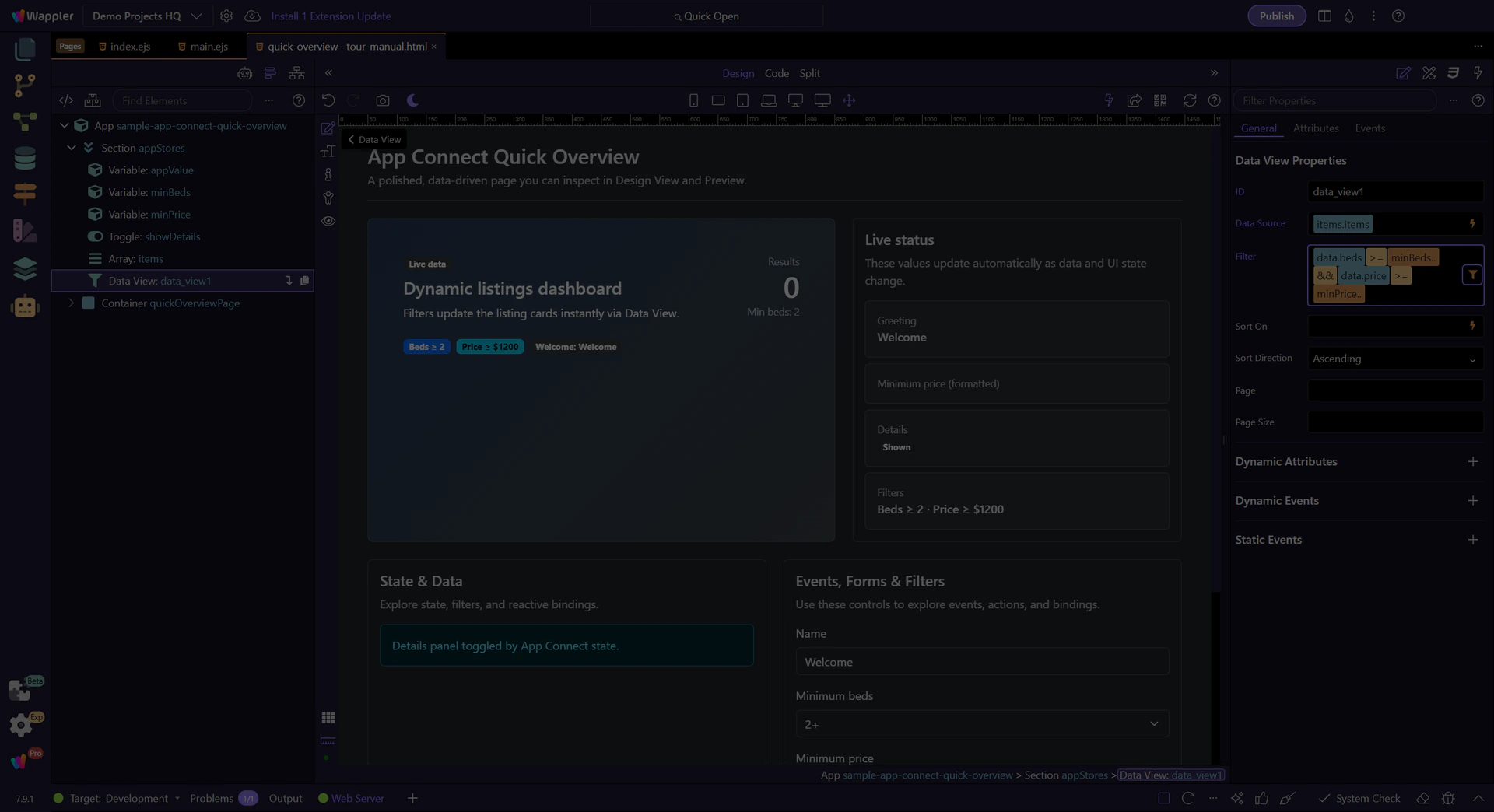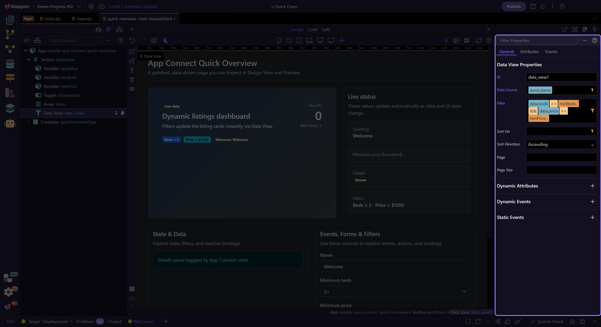 This tour opens a dedicated App Connect page so you can inspect the exact UI Wappler uses for visual condition building, from the filter field in Properties to the Expression Builder popup.