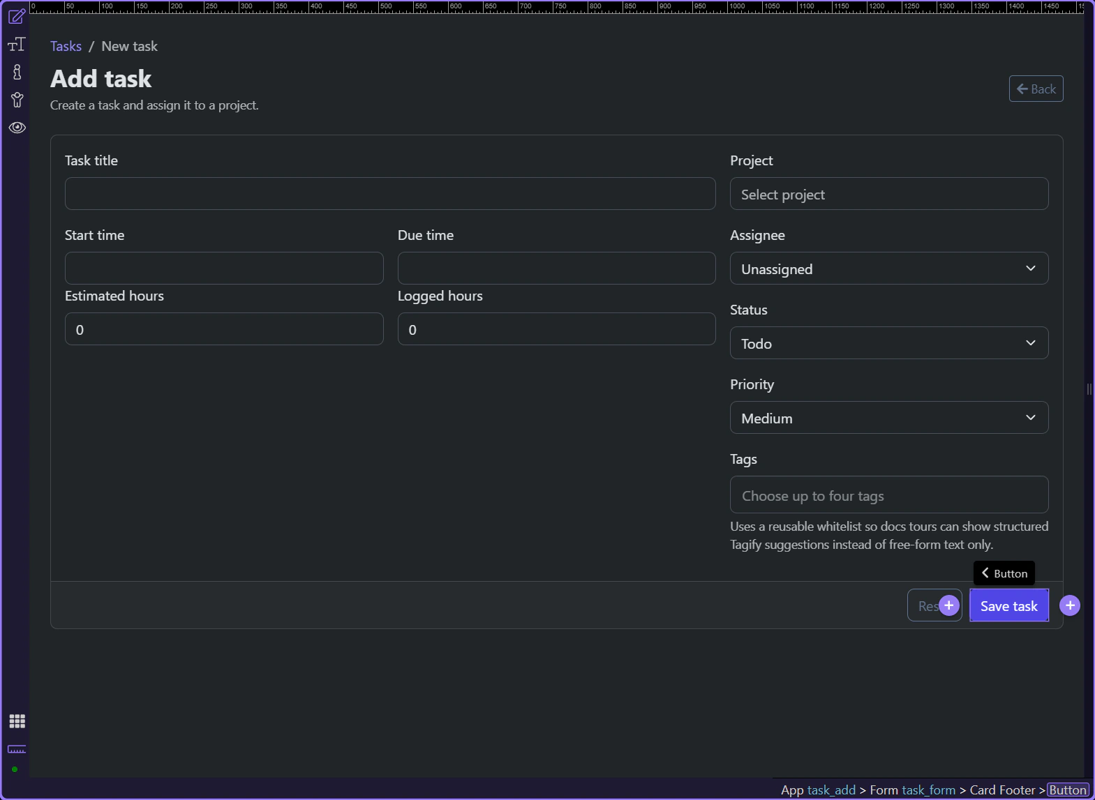 Section titled “The submit button reflects request state”The save button is disabled while task_form.state.executing is true, so the page makes the request lifecycle visible instead of leaving the user to guess whether the form started working. That feedback belongs to the same submit contract as the action URL itself.
