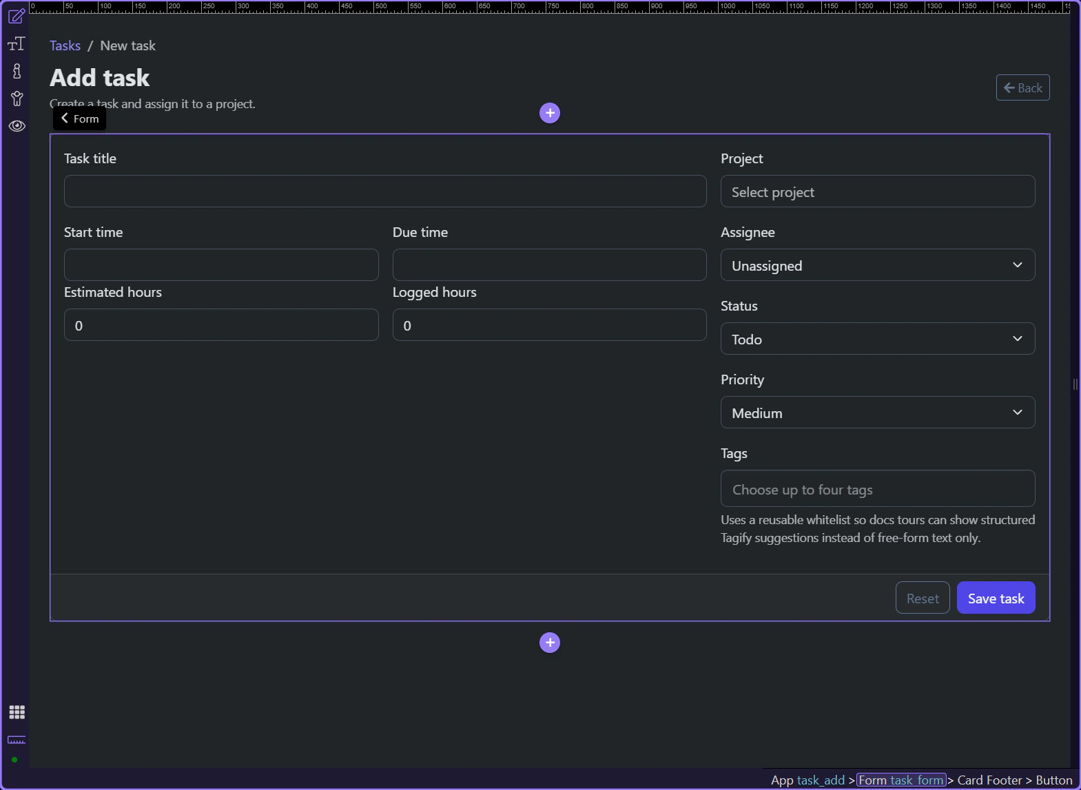 Section titled “A form submit is a contract with a server action”The new-task page in Demo Projects HQ is a good baseline because it does not stop at field collection. The form, its action URL, its success branch, and its error state all live together on one page, so the handoff from browser input to server processing stays readable.
