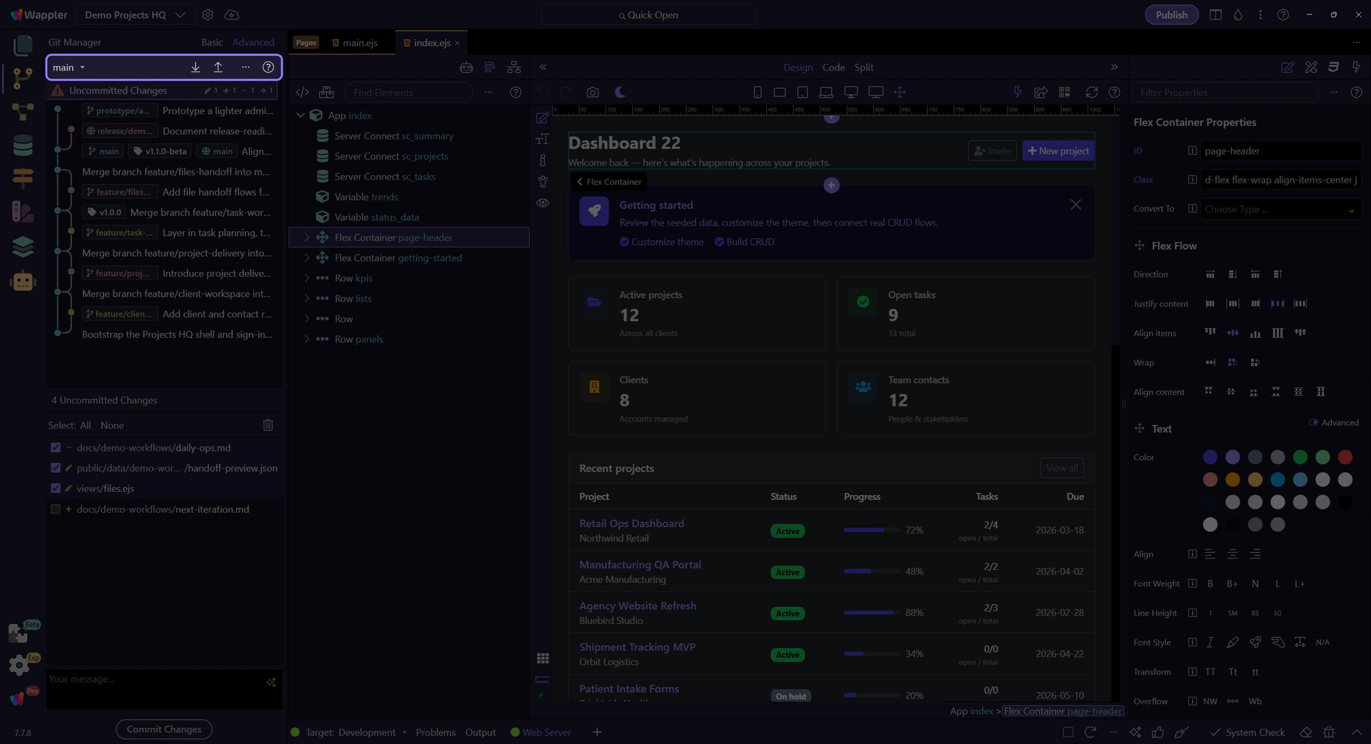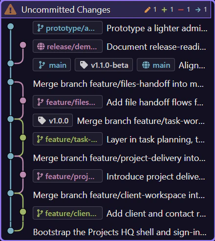 Section titled “Uncommitted Changes anchors the current working tree”The pinned Uncommitted Changes row at the top of the list switches the detail workspace from recorded history to the current working tree. In Demo Projects HQ, that workspace lists the files that are modified, deleted, renamed, or still untracked right now. This is the row that answers the practical question: what would go into the next commit?
