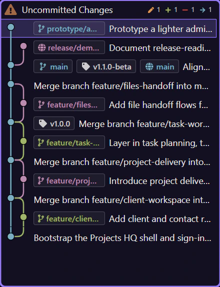 Section titled “Recovery starts with choosing the least destructive tool”Think of recovery as choosing the smallest reliable restore operation. In Git Manager, history, tags, and file-level actions give you several ways to go back to a previous point without panicking: restore one file, undo a commit safely, inspect an older checkpoint, or return to a named tag before a demo or release. The right tool depends on how much of the past state you actually need back.