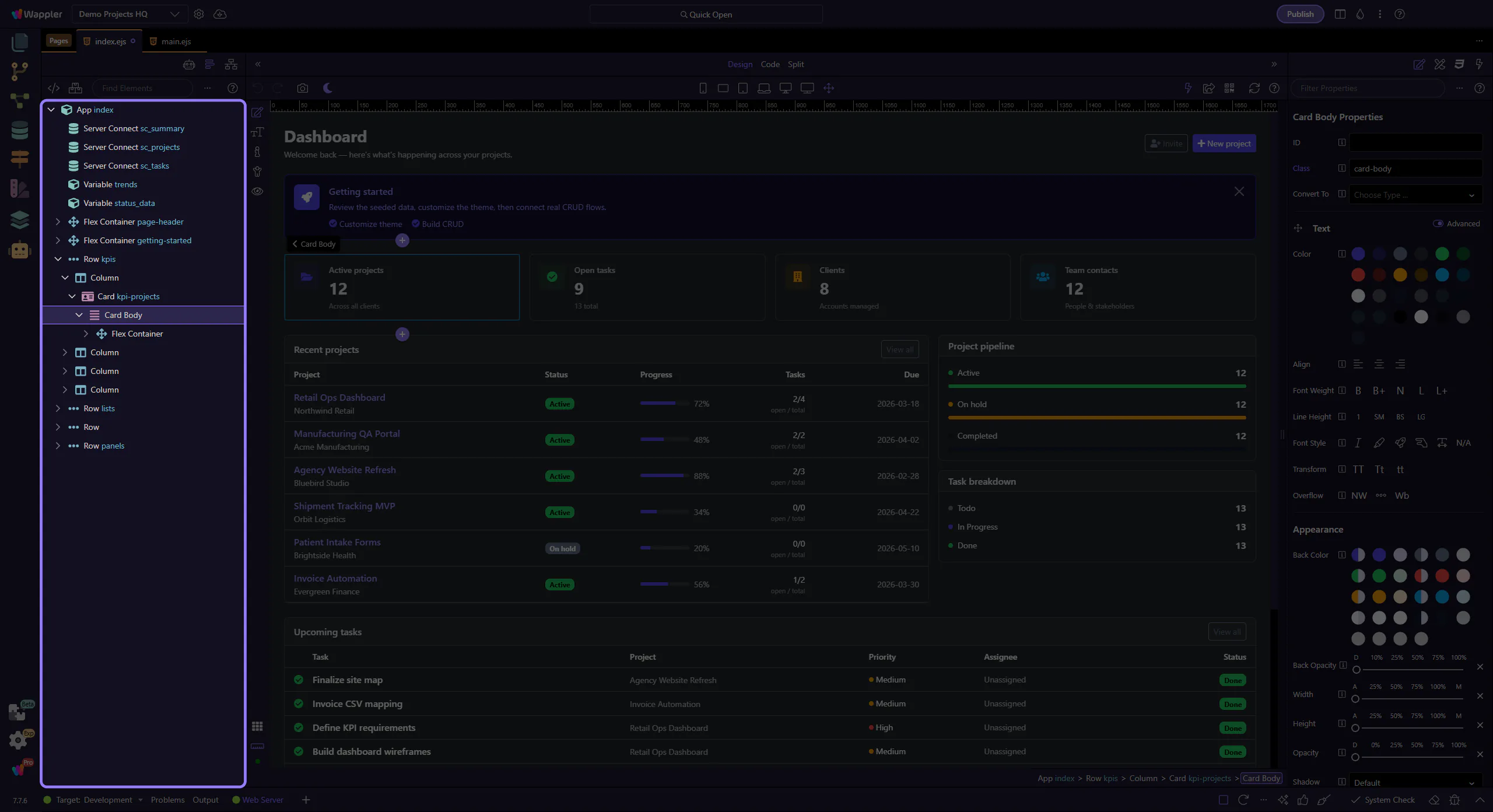 Section titled “Structure panel”Inserting a component is easier when you first understand where structure and insertion meet in the HTML Editor. This how-to begins in that shared context, then shows how Wappler guides you from selecting the right location to placing the new component where it belongs.