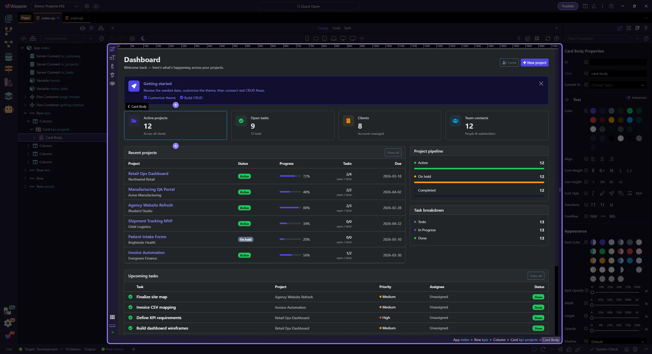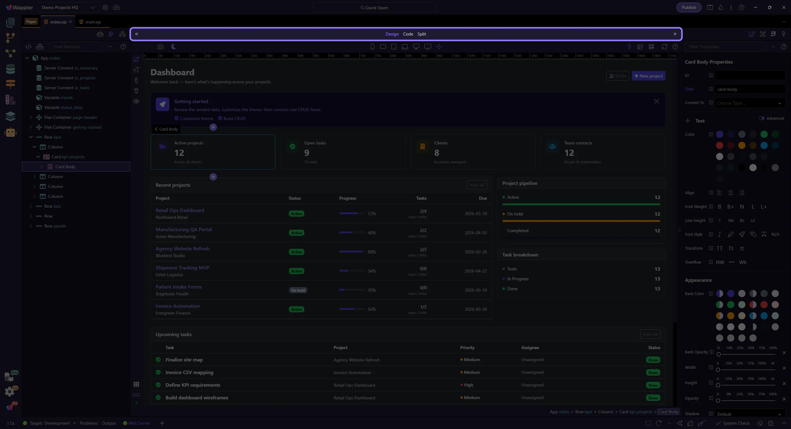 Section titled “Switch to Design View”Design View is the live editing surface where page structure becomes something you can inspect and manipulate directly. This overview explains why the view matters, what kind of work belongs here, and how it connects to the toolbar and panels you use for deeper changes.