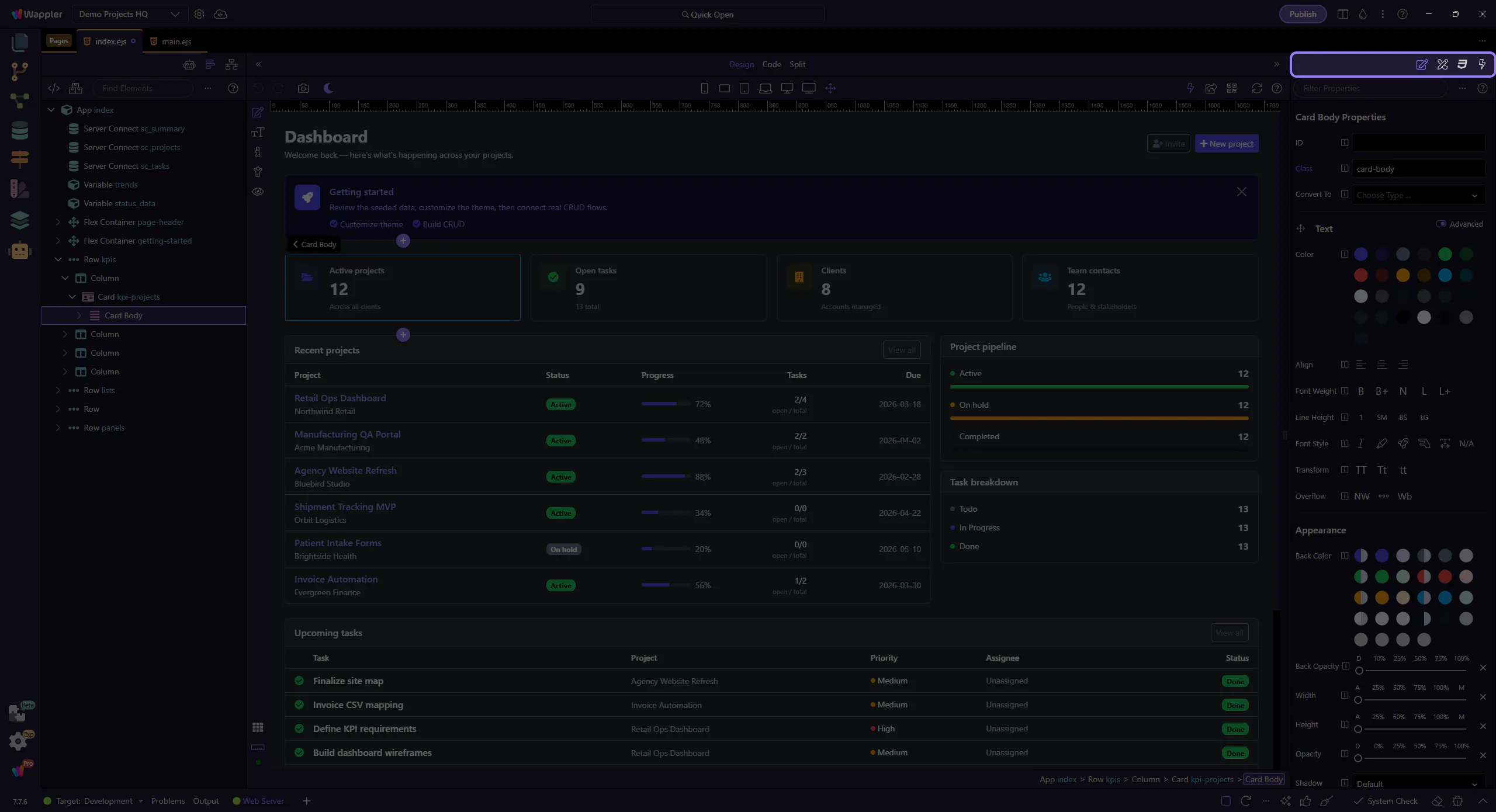 Section titled “Selection Panels”The selection panels are where Wappler turns a chosen element into actionable settings, styles, and data context. This overview explains how those panels work together, why they matter to everyday editing, and how the focused tours build on this same selection-first workflow.
