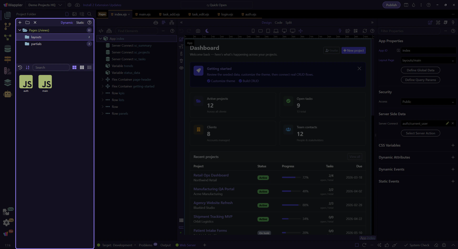 Section titled “Dynamic vs Static”If your project has a server model, the top Pages Manager area can expose a switch between Dynamic pages (server views) and Static pages (site root).