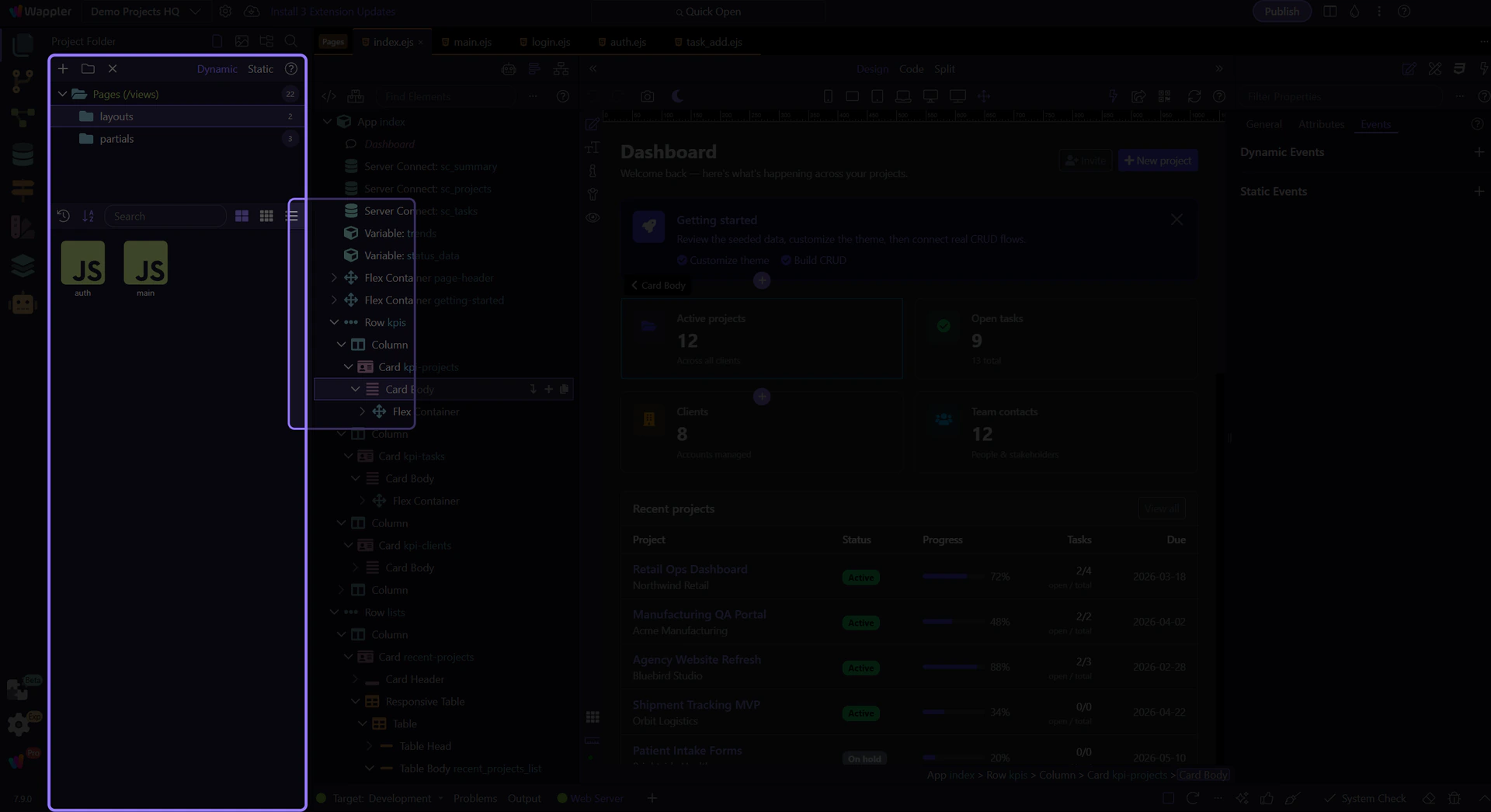 Your guided index of App Connect tours: reactive model, data components, bindings, events/actions, and common workflows — explained visually in Wappler’s panels and pickers.