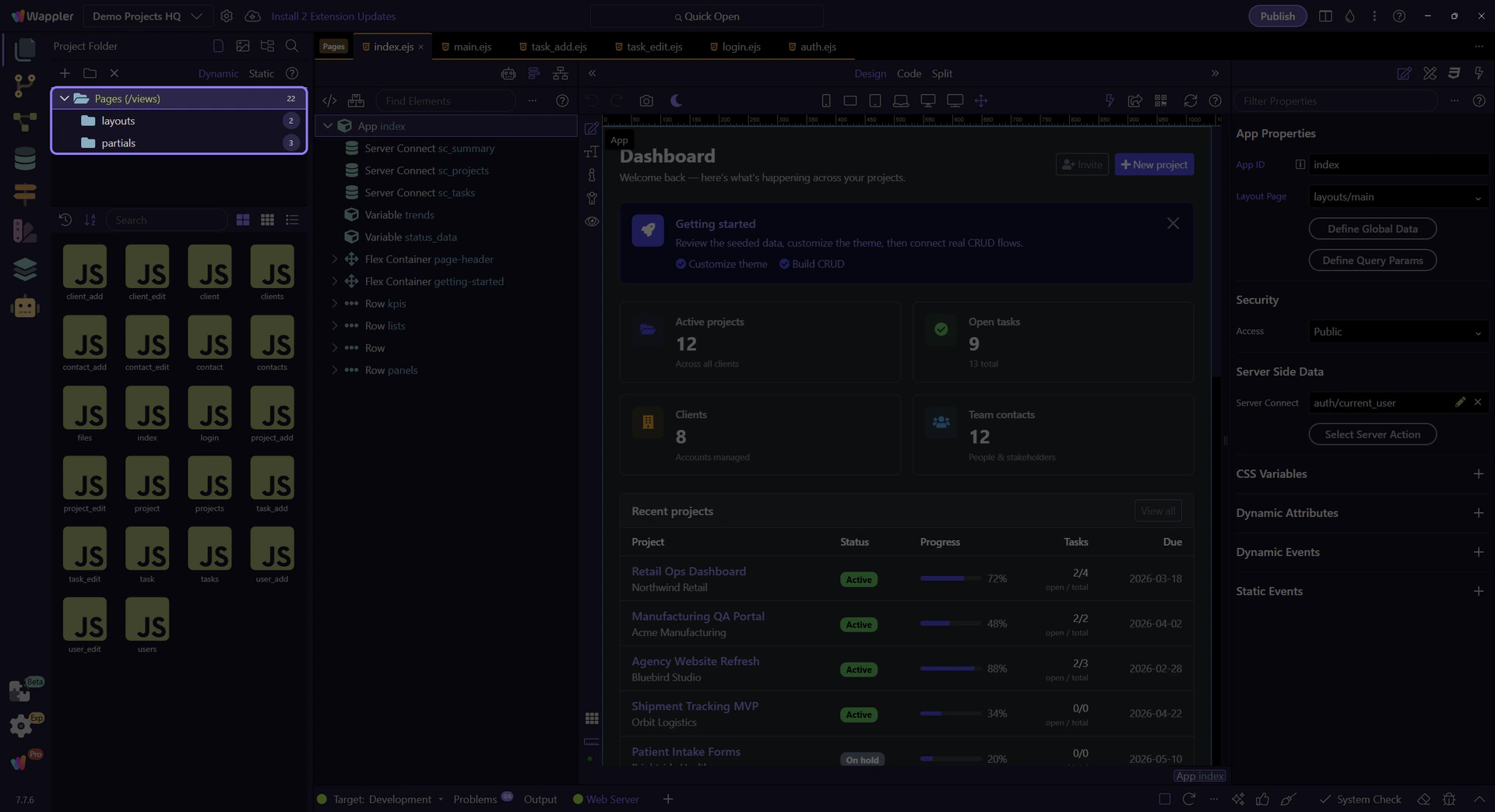 Section titled “Move into Editing”Once the right folder is selected, the next move is to open the actual page or layout tile you want. This step points at the live main.ejs layout tile from Demo Projects HQ and uses it as the concrete handoff into the HTML Editor.