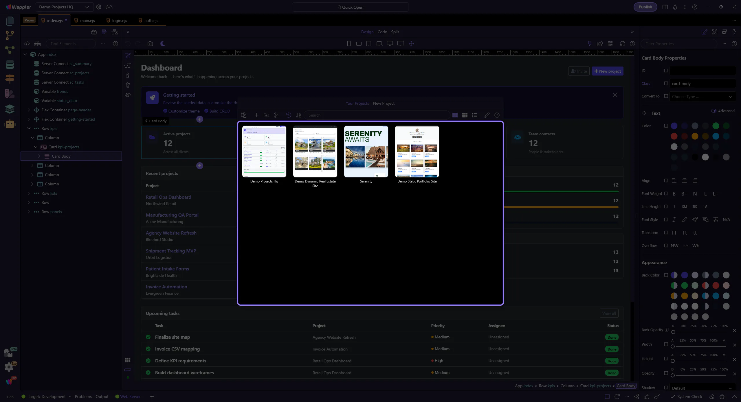 Section titled “Projects List”This list shows all known projects. Select a project to open it in Wappler. This step matters because Projects List is part of Manager Projectsmanagerpicker, and understanding that context makes the next action easier to repeat in your own project.