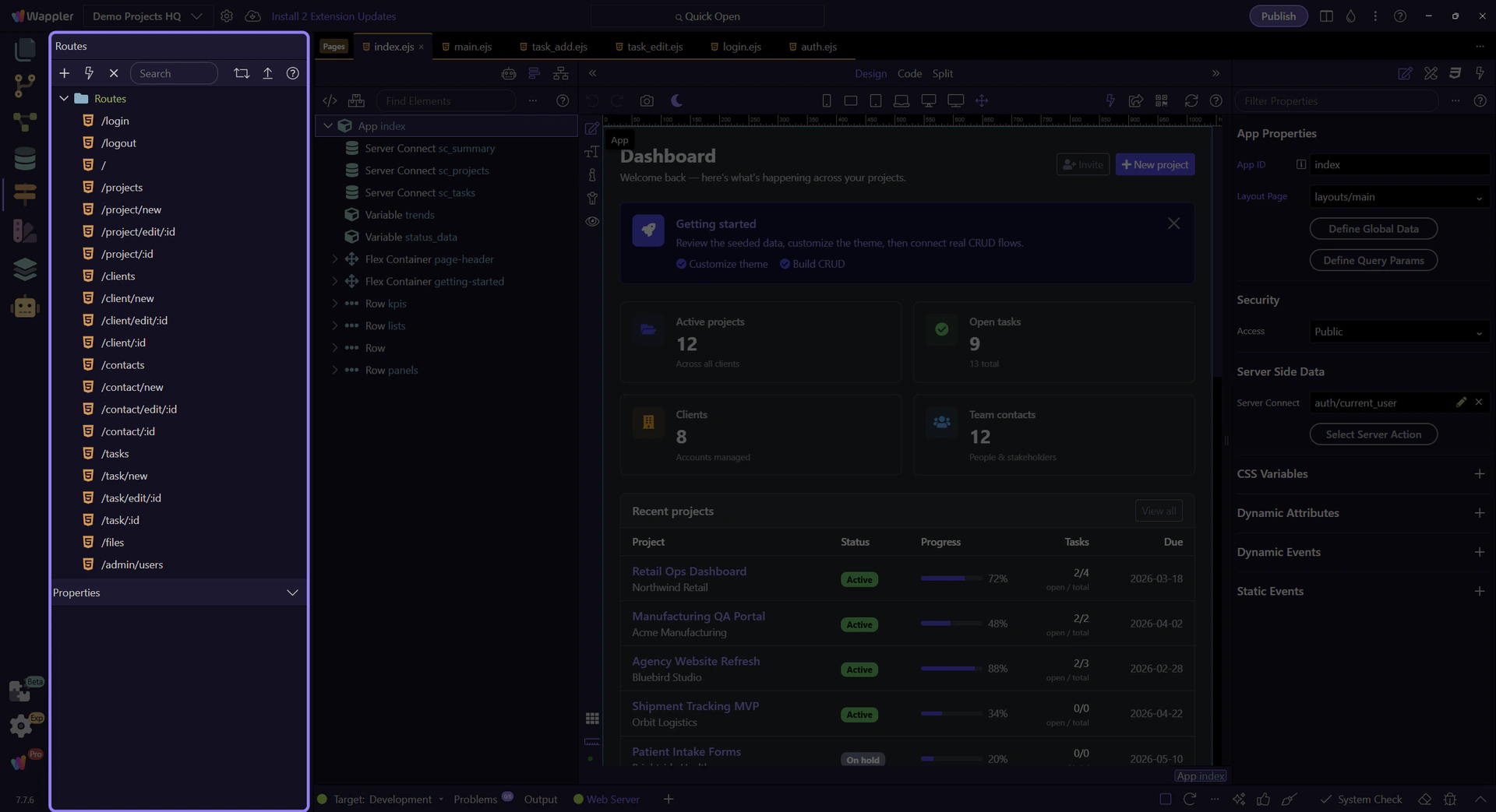 Section titled “Routing Manager is the live source of truth”Start from the live Routing Manager surface in Demo Projects HQ. This is where Wappler keeps the generated route map for the project, so it is the correct entry point for understanding how URLs, layouts, and routed content pages are actually connected.