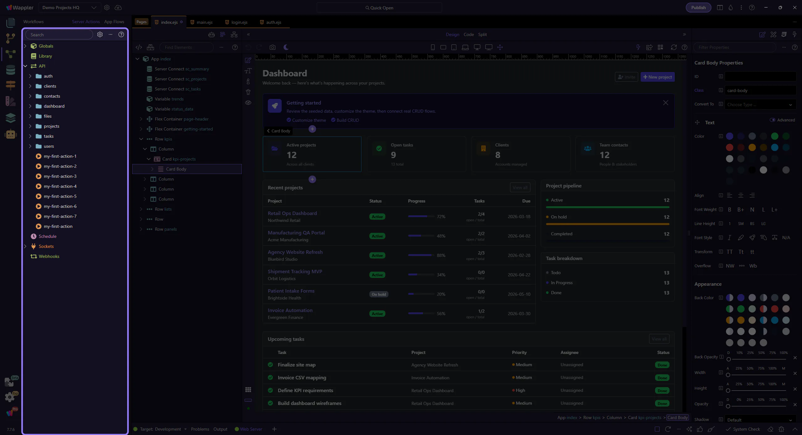 See how Security Providers drive login sessions, action restrictions, and protected page flows across a Wappler project.