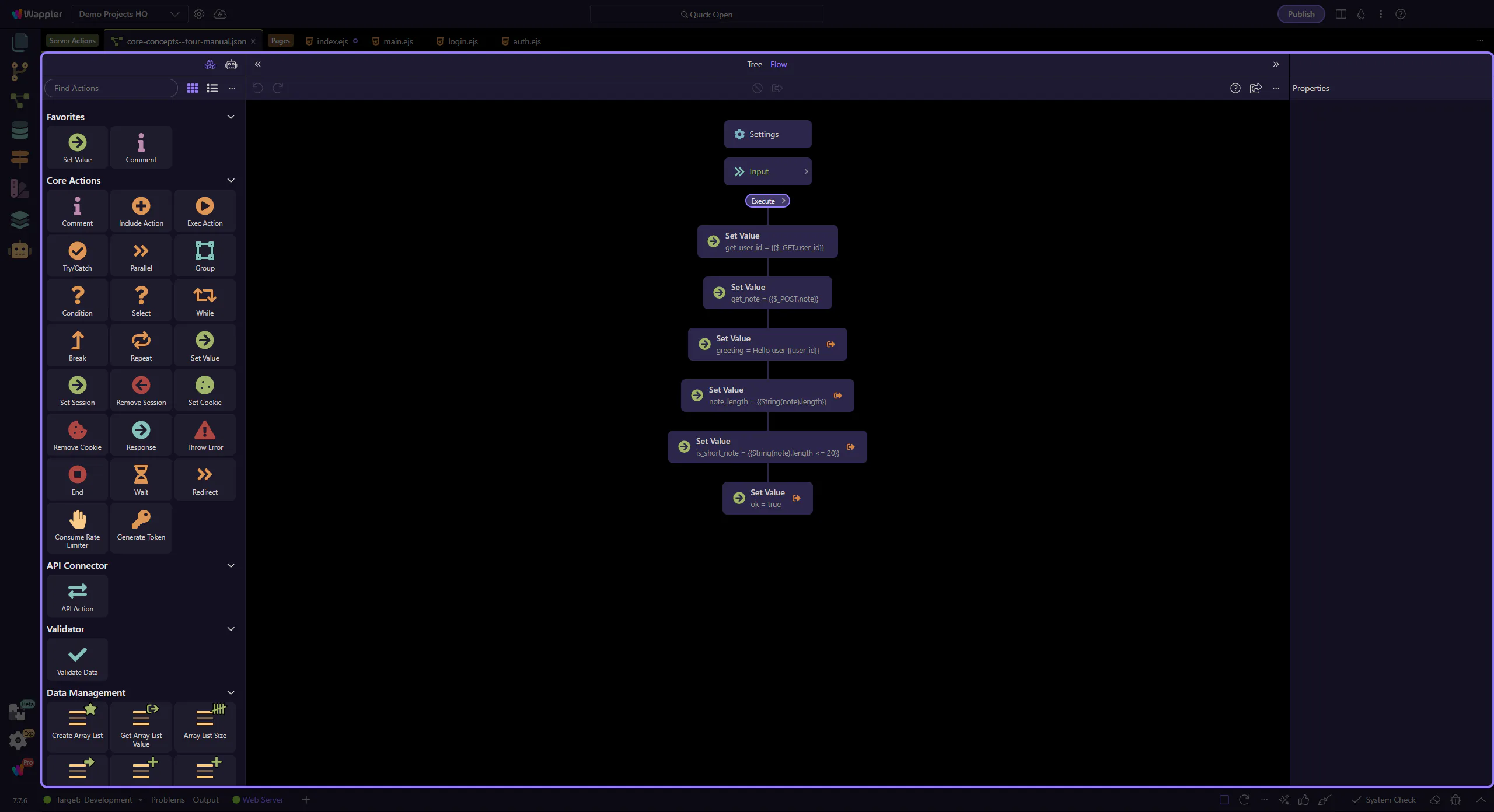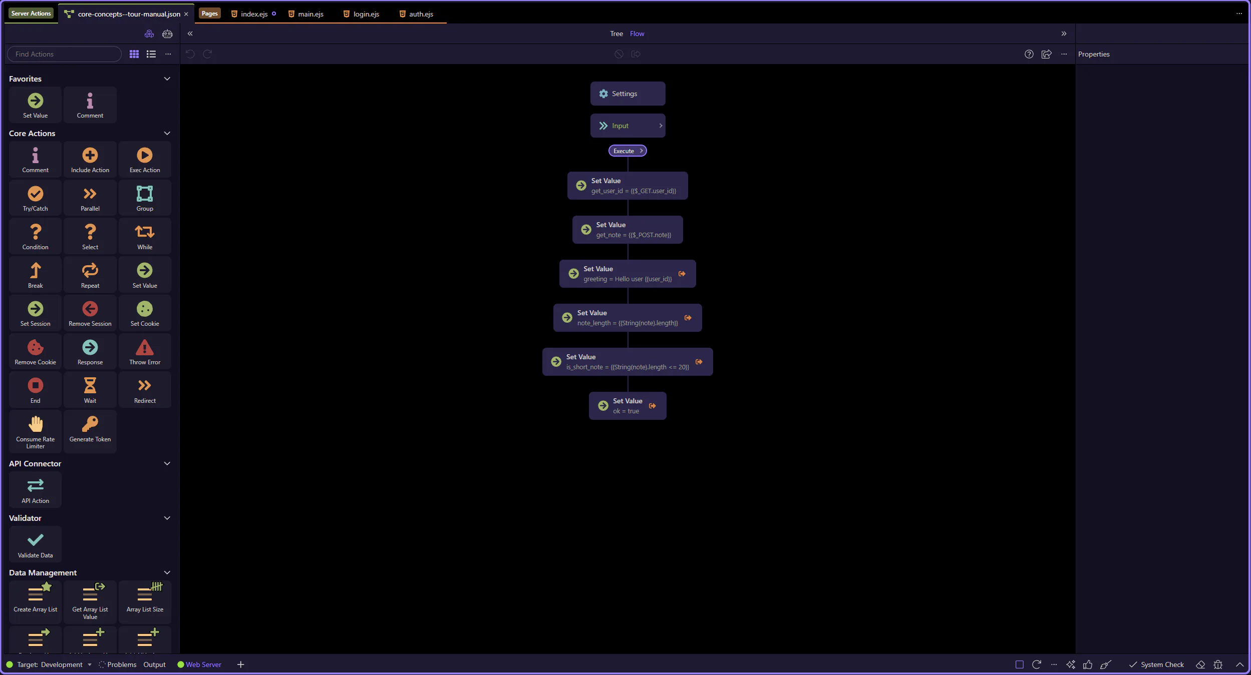 Section titled “Core concepts”This tour builds the basic mental model for Server Connect Actions: inputs go in, steps process data, and the output defines the JSON your client receives.