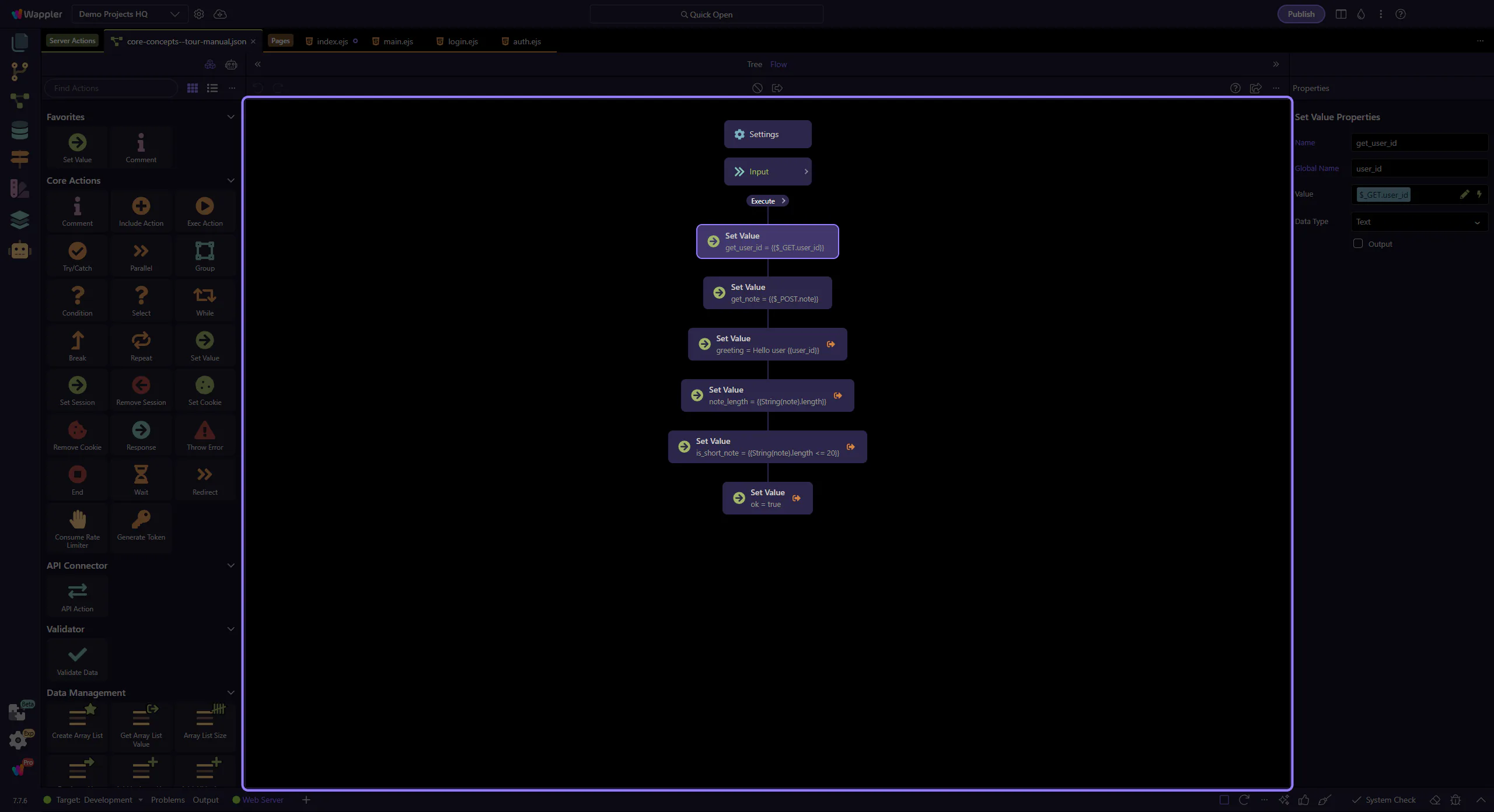 Section titled “Core action: Set Value (the workhorse)”The selected step is a Core → Set Value action.