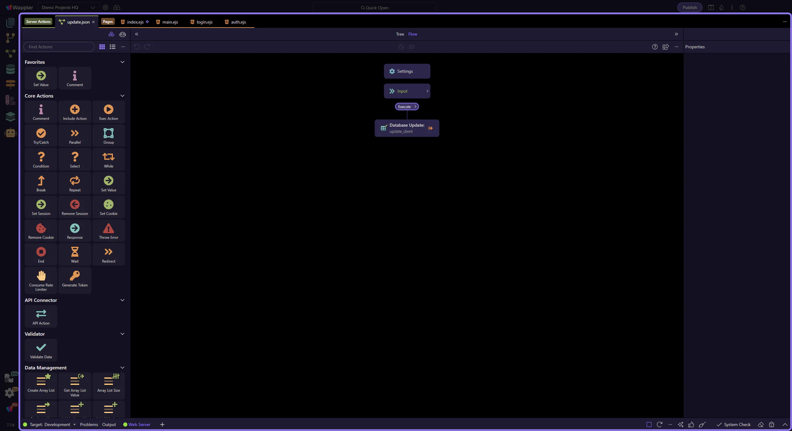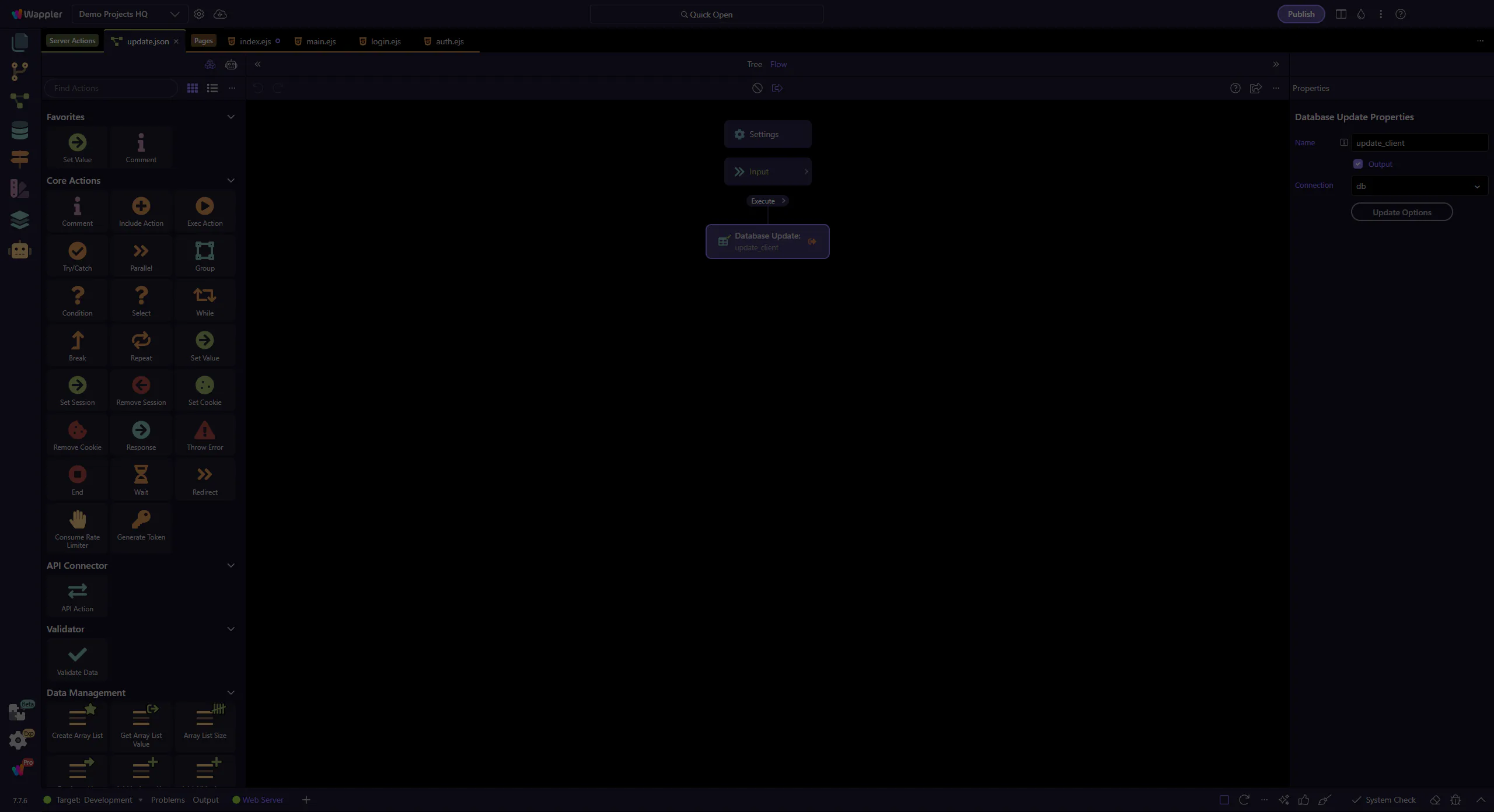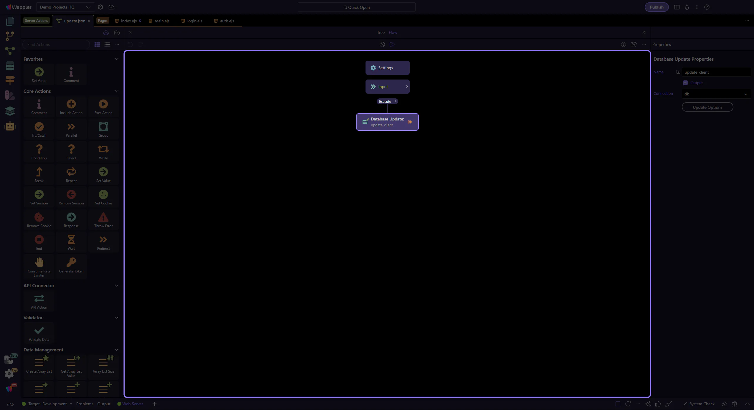 Section titled “The UPDATE step is selected”This step selects the update_client workflow step so its SQL/Updater options are shown in the Properties panel.