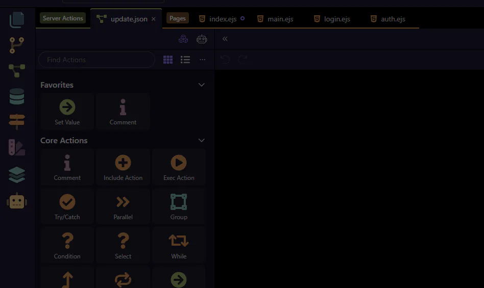 Section titled “The Server Connect editor is now the focus”The action now opens in the dedicated Server Connect editor. Collapse the manager so the workflow tree and Properties panel become the clear focus before selecting the database step.