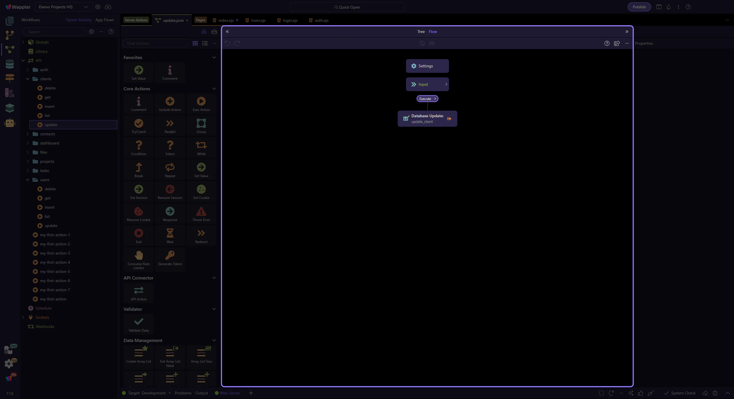 Section titled “Editor workspace”This is the dedicated Server Connect Actions editor. This workspace is optimized for editing a single action: steps on the left/center, properties on the side, and quick toggles in the header toolbars.