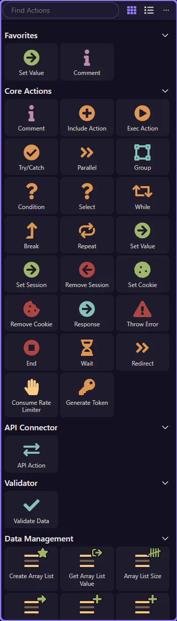 Section titled “Actions panel (inserting steps)”When the Actions panel is available, it’s your catalog of step types.