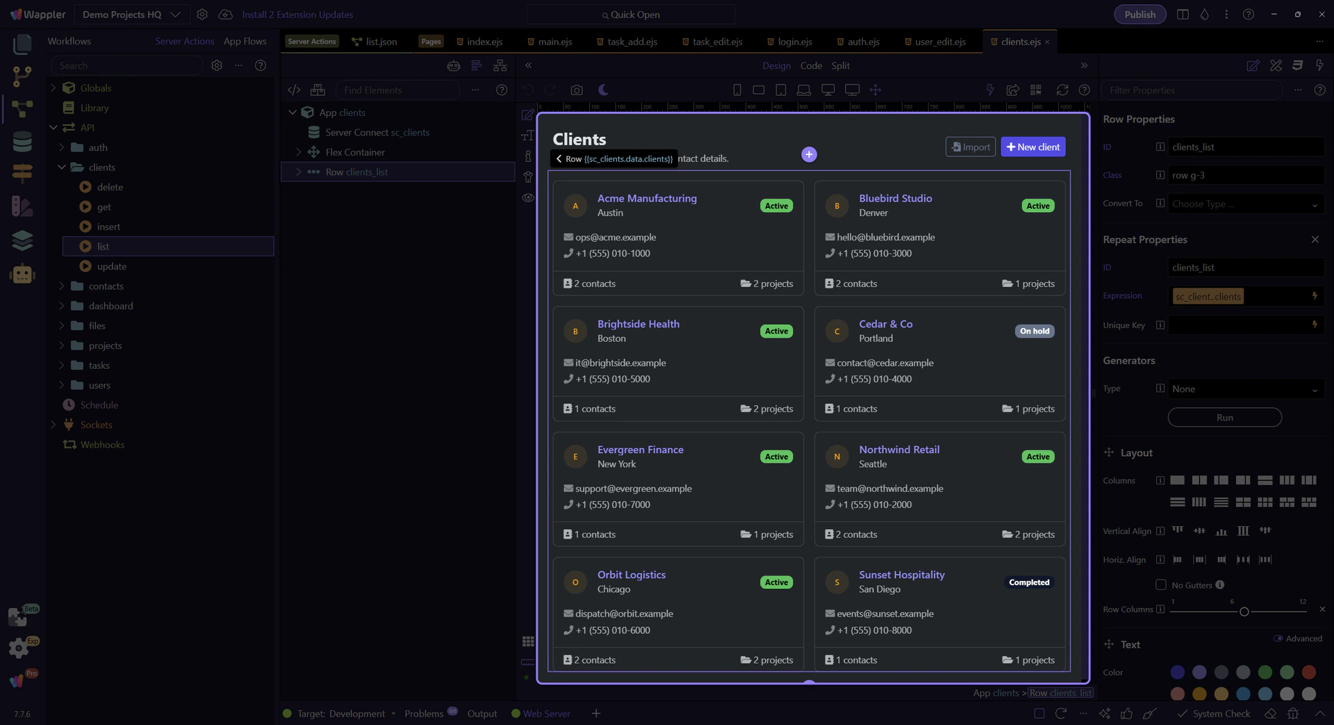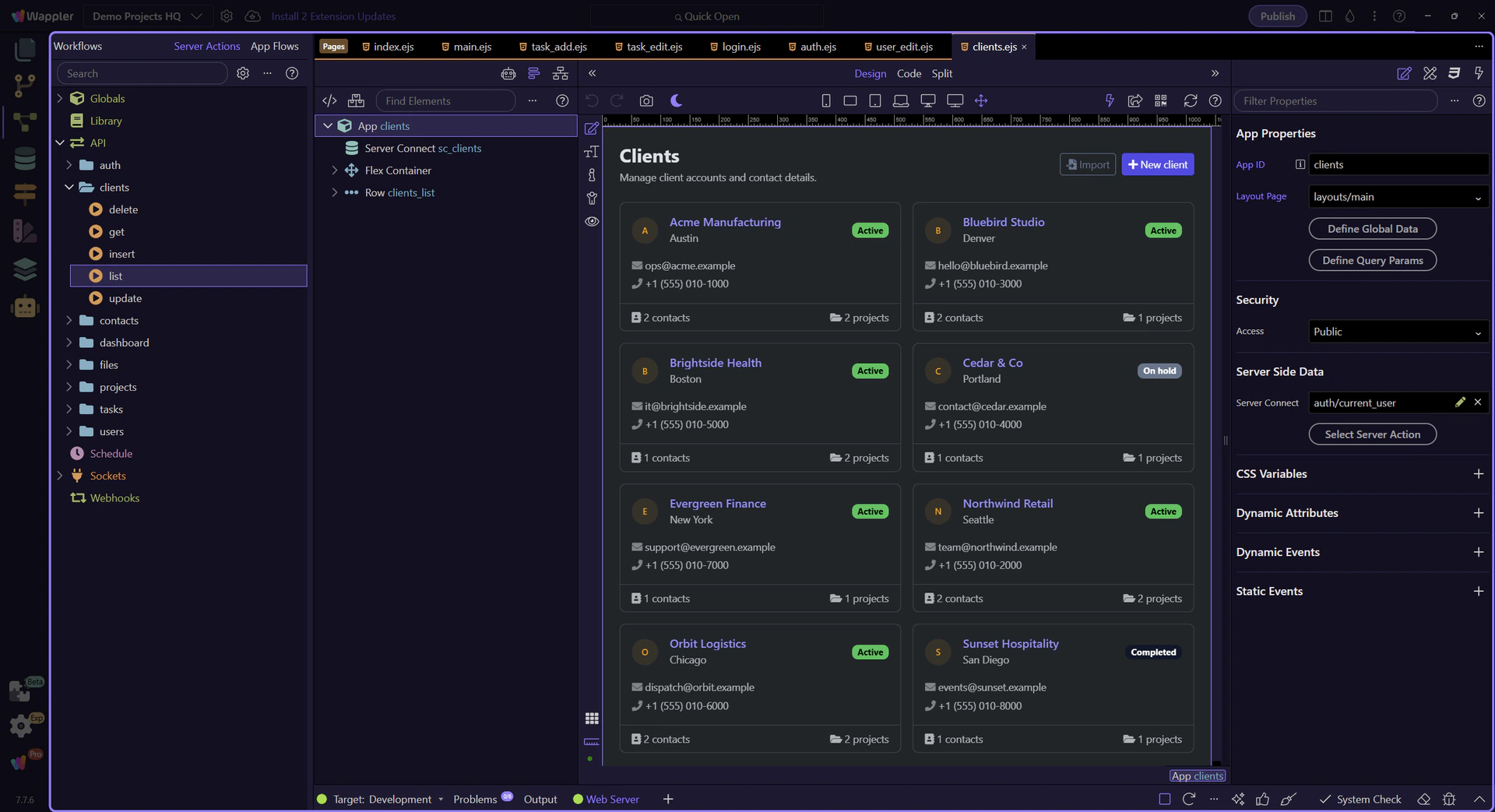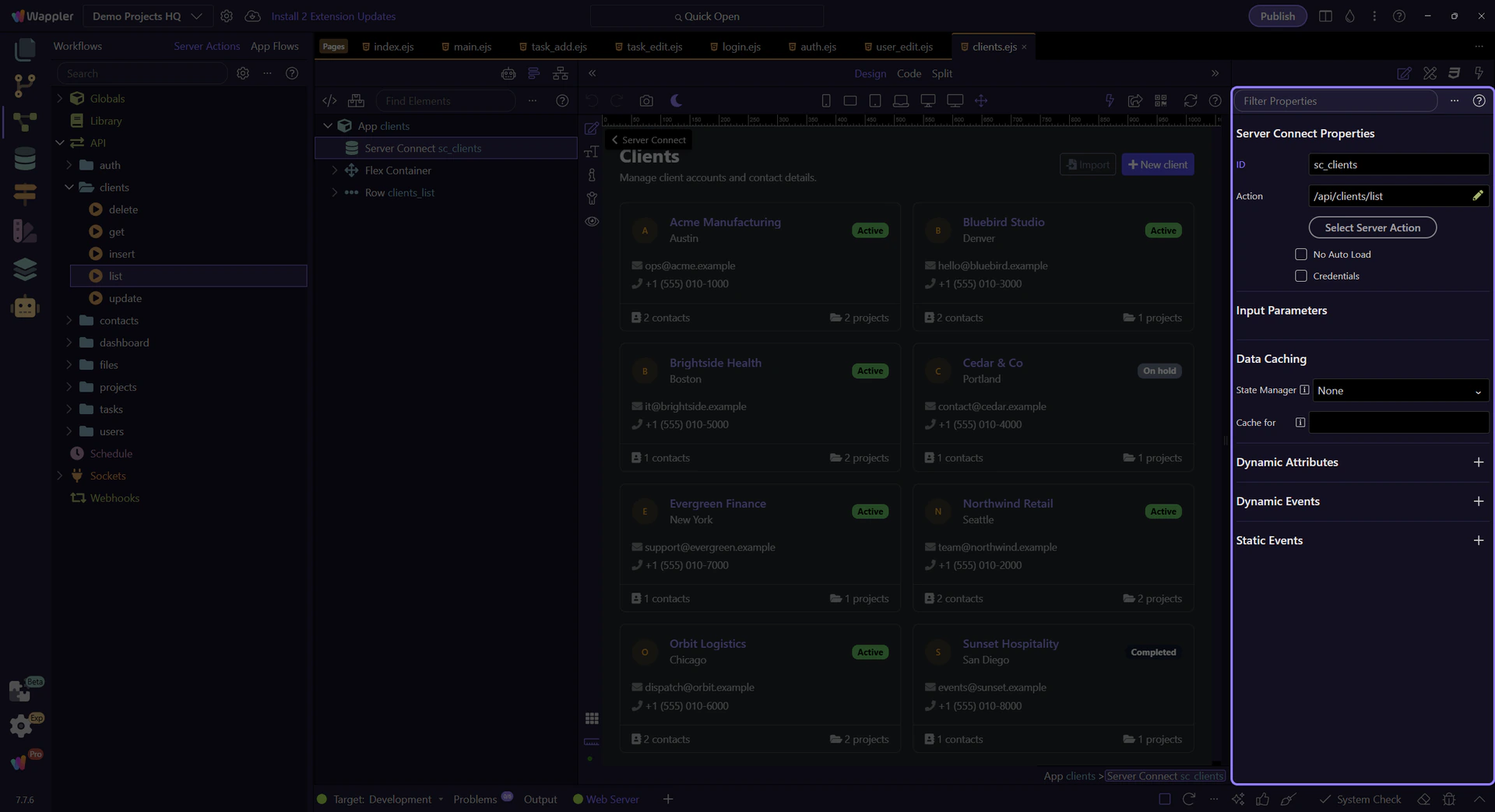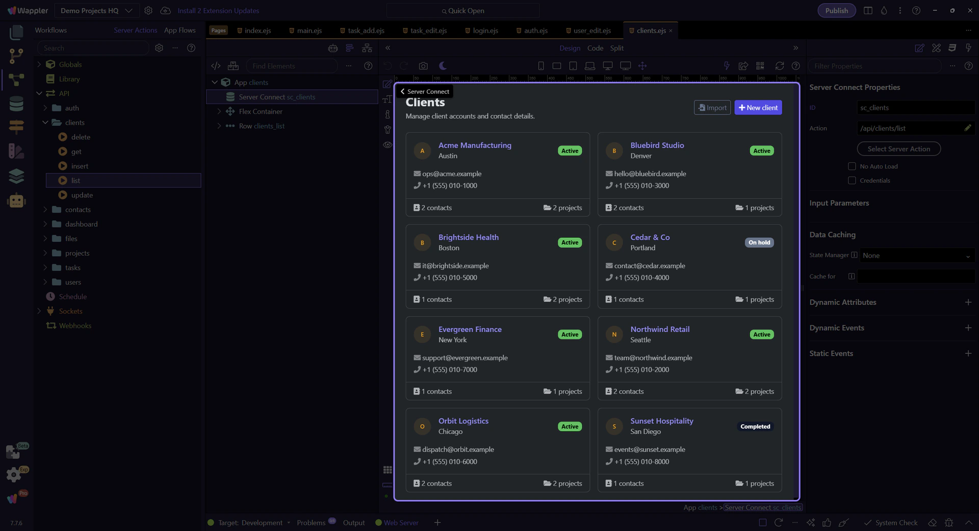 Trace the Clients list page end-to-end: a Server Connect SELECT action feeds a dmx-serverconnect component and a repeater.