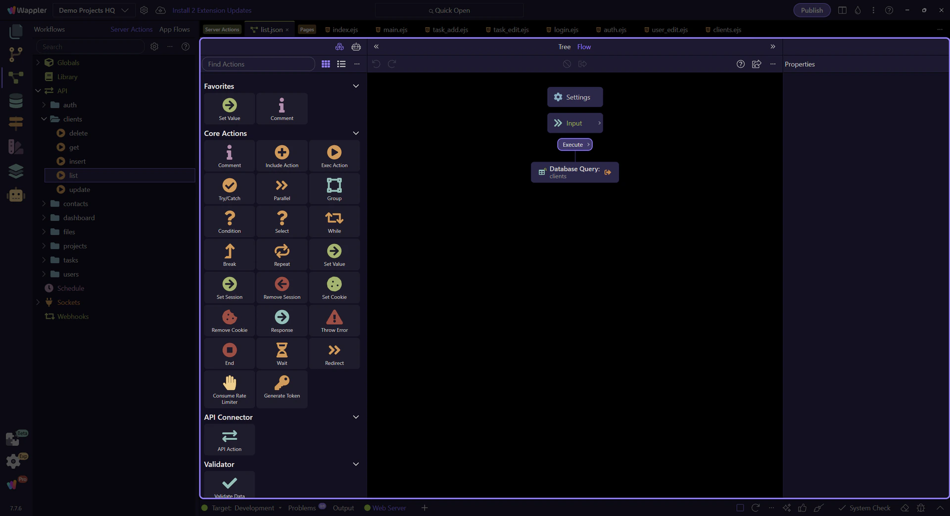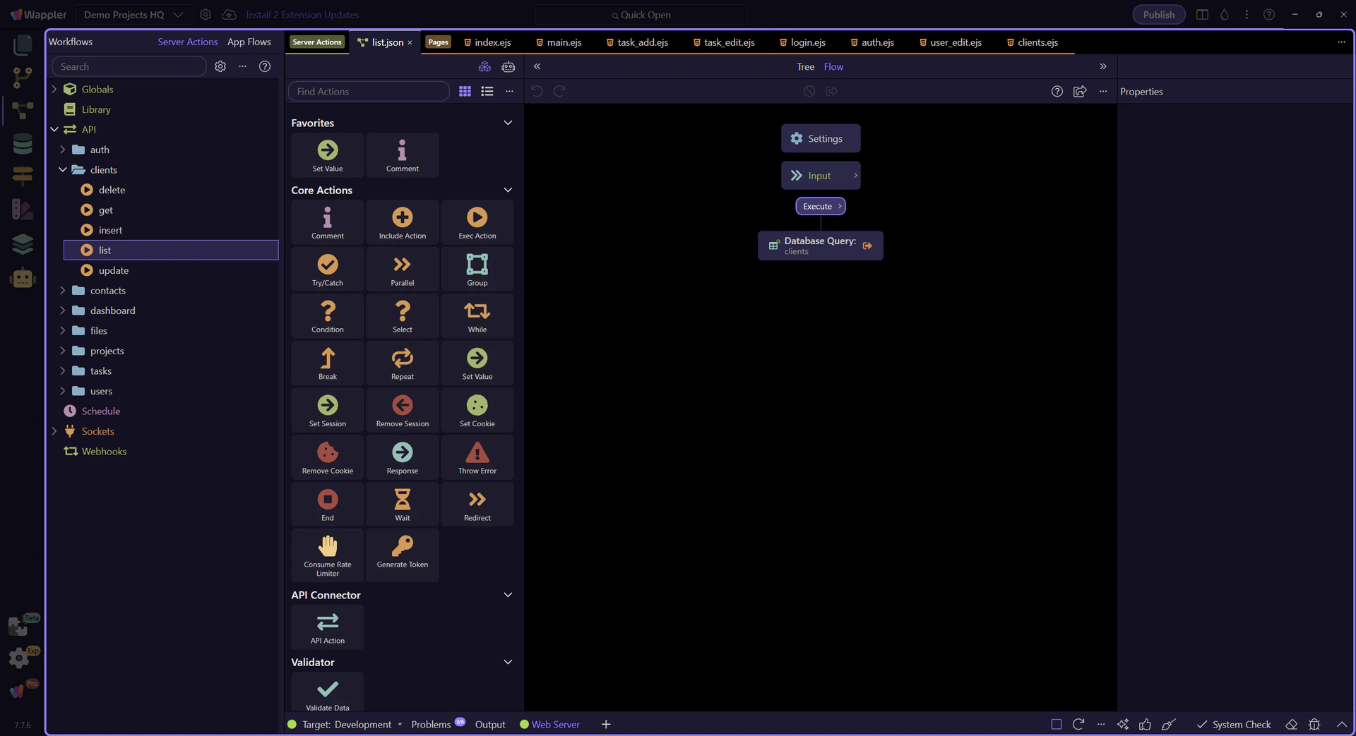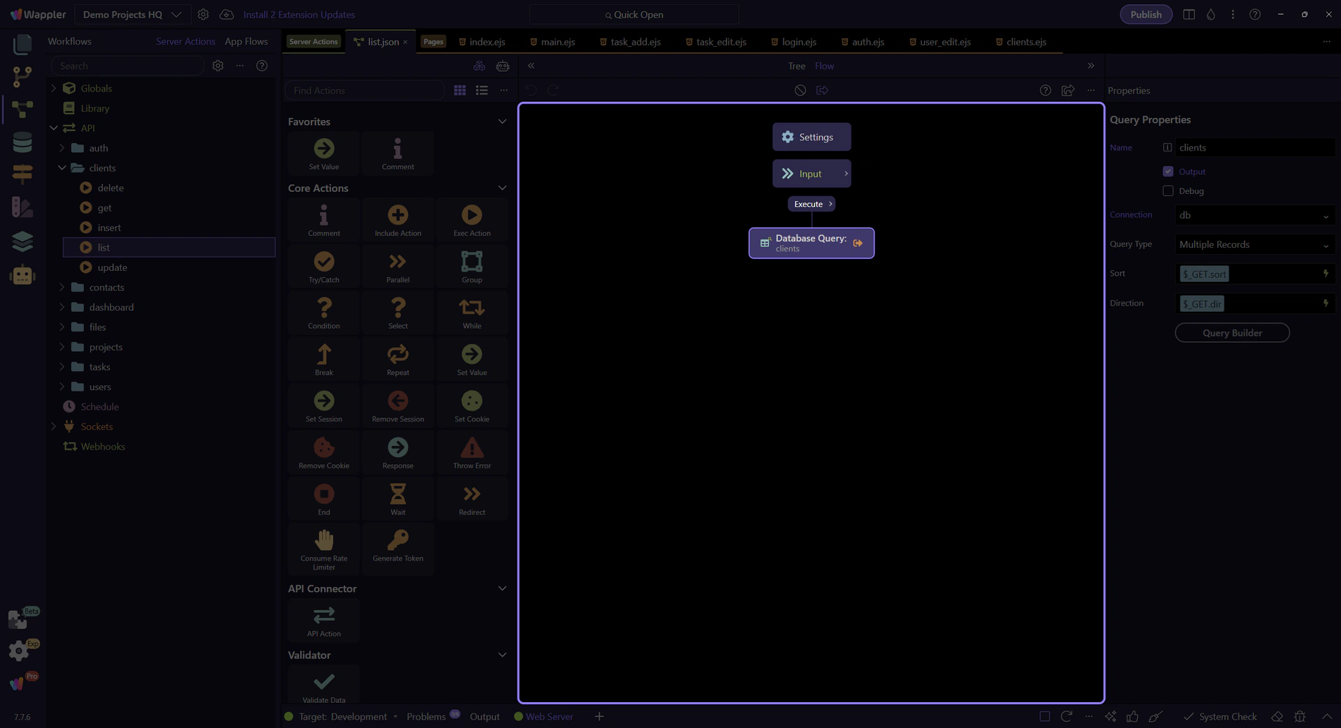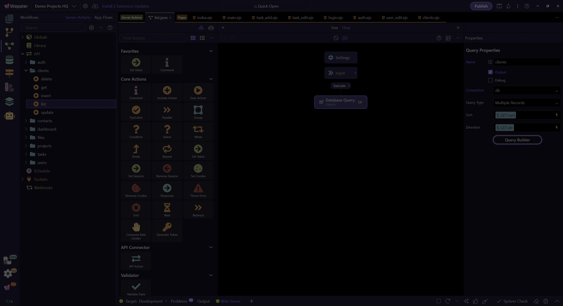 Trace the Clients list page end-to-end: a Server Connect SELECT action feeds a dmx-serverconnect component and a repeater.