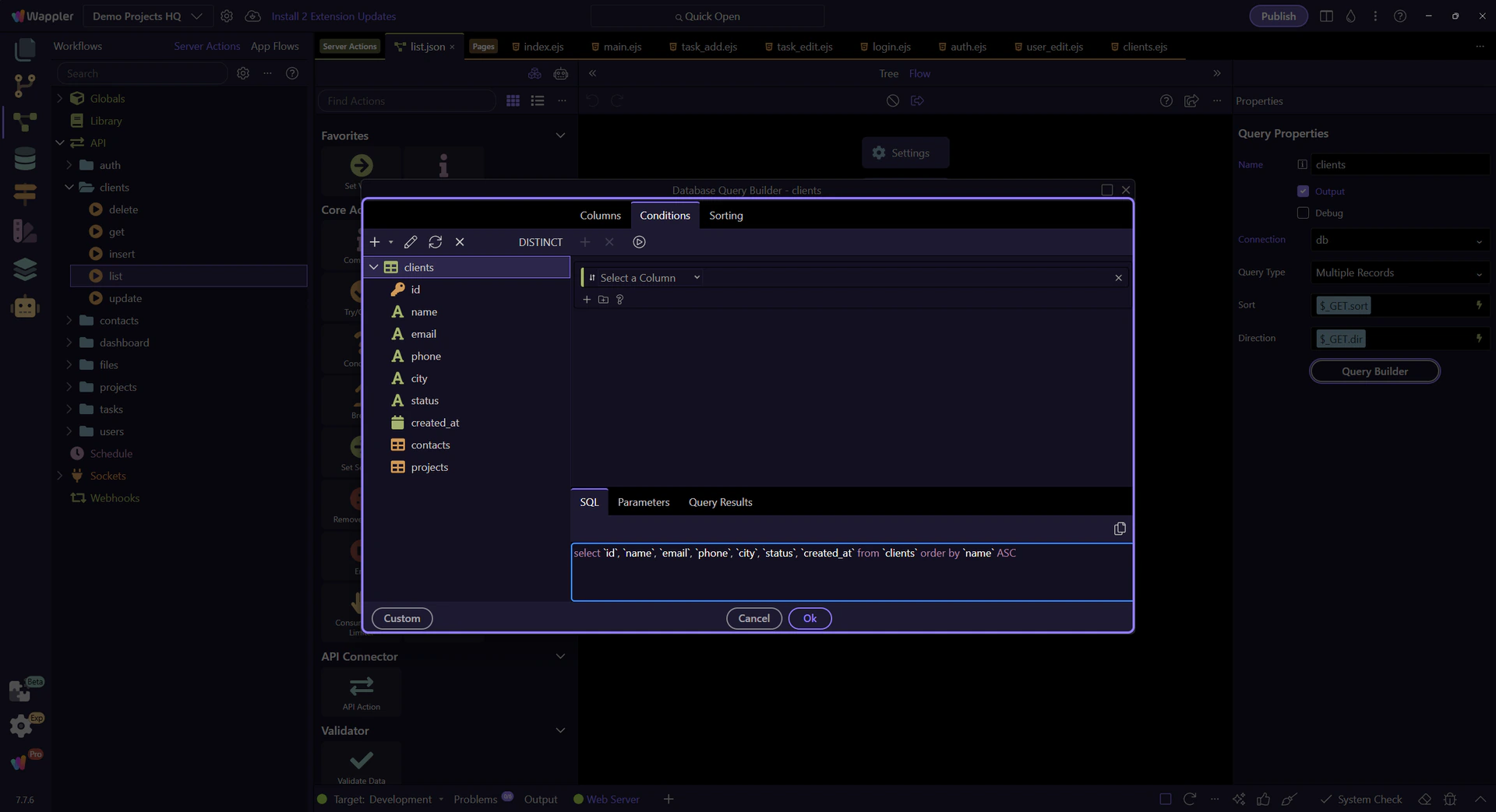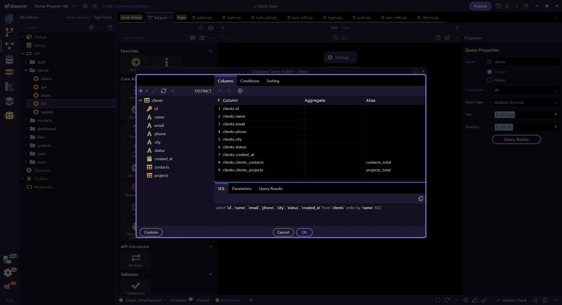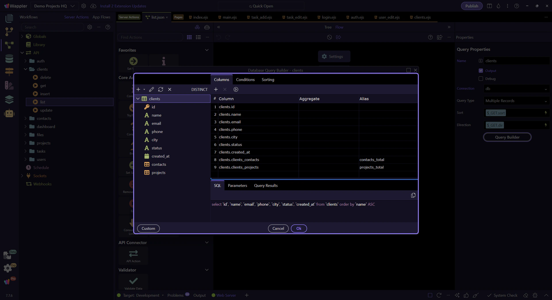 Section titled “Database Query Builder dialog”This dialog shows the structured SELECT query behind the clients step. From here you can inspect the source table, returned columns, filters, sorting, and preview output.