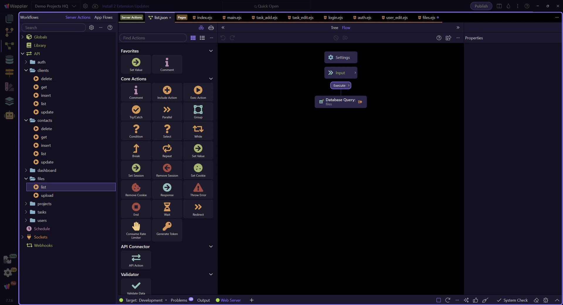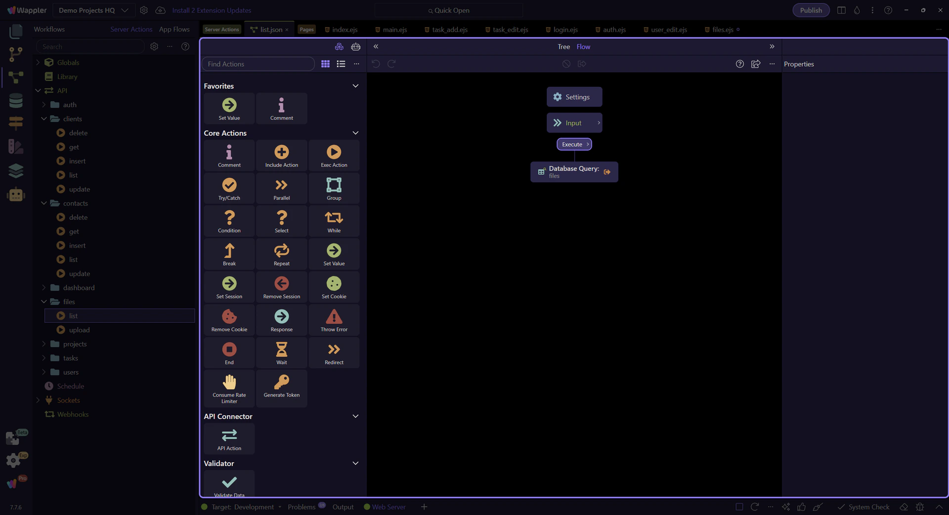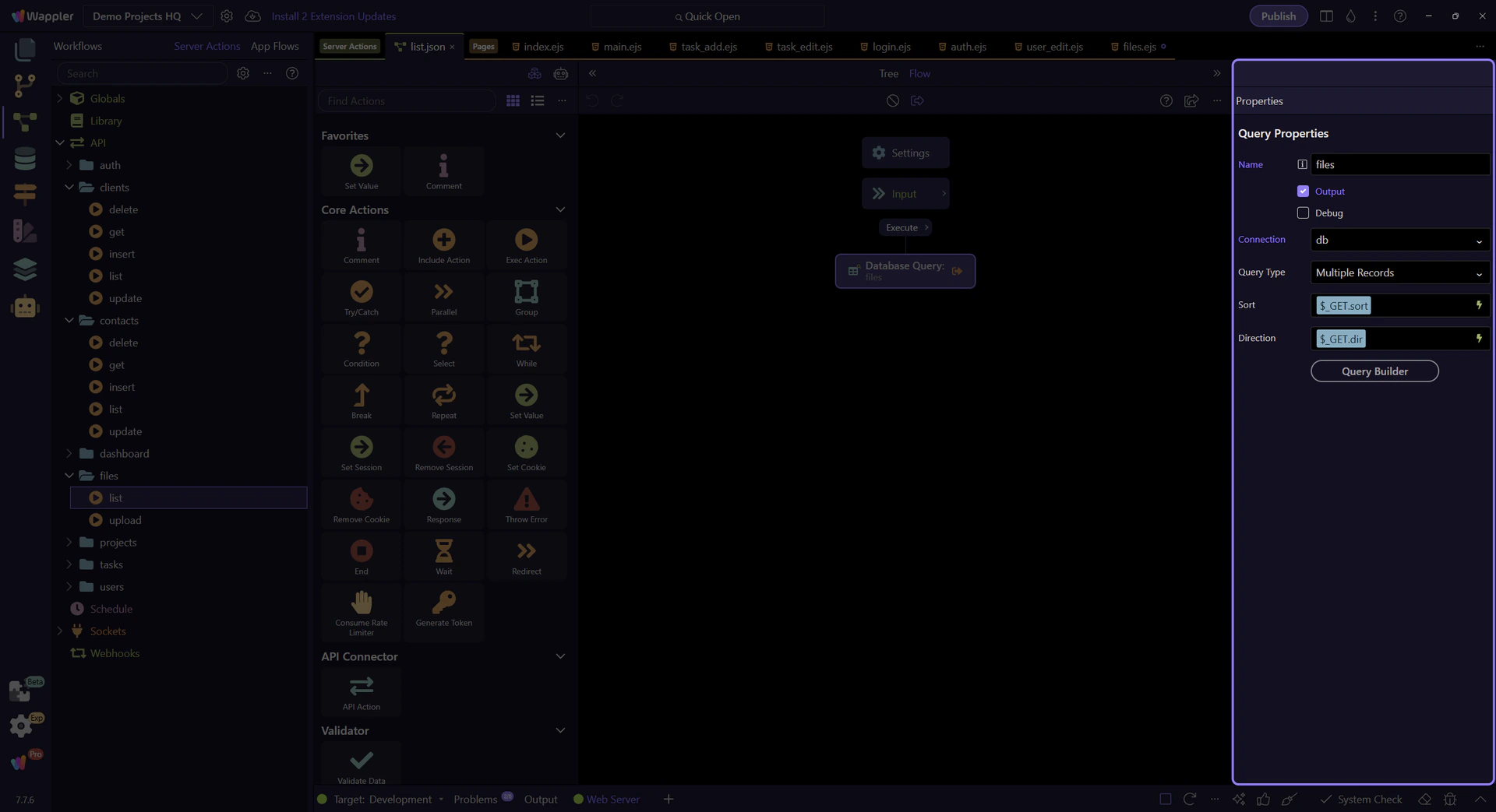 Section titled “The files list action opens in the Server Connect editor”The real list action is now visible in the editor. This is the backend counterpart to the files table, and it keeps the downstream file library readable by gathering the file rows and their context in one query.