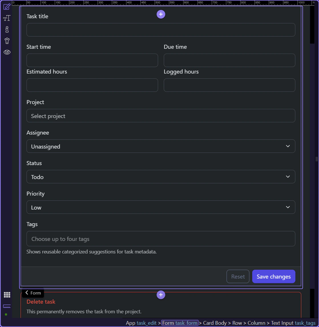 Section titled “Introduction”The Demo Projects HQ task edit flow is useful because it keeps the full edit lifecycle visible in one place. The page loads the current record, posts updates to one Server Connect action, posts deletes to another, and shows the result of each request back on the same screen.