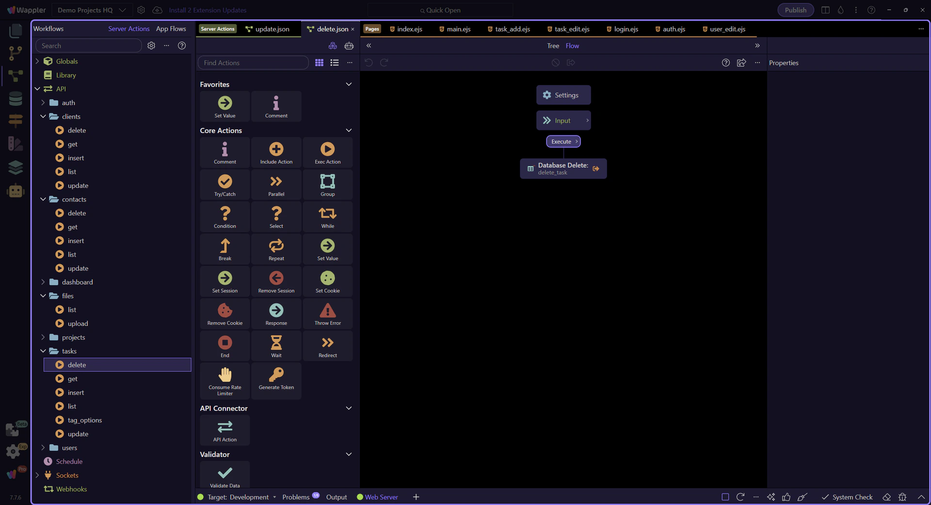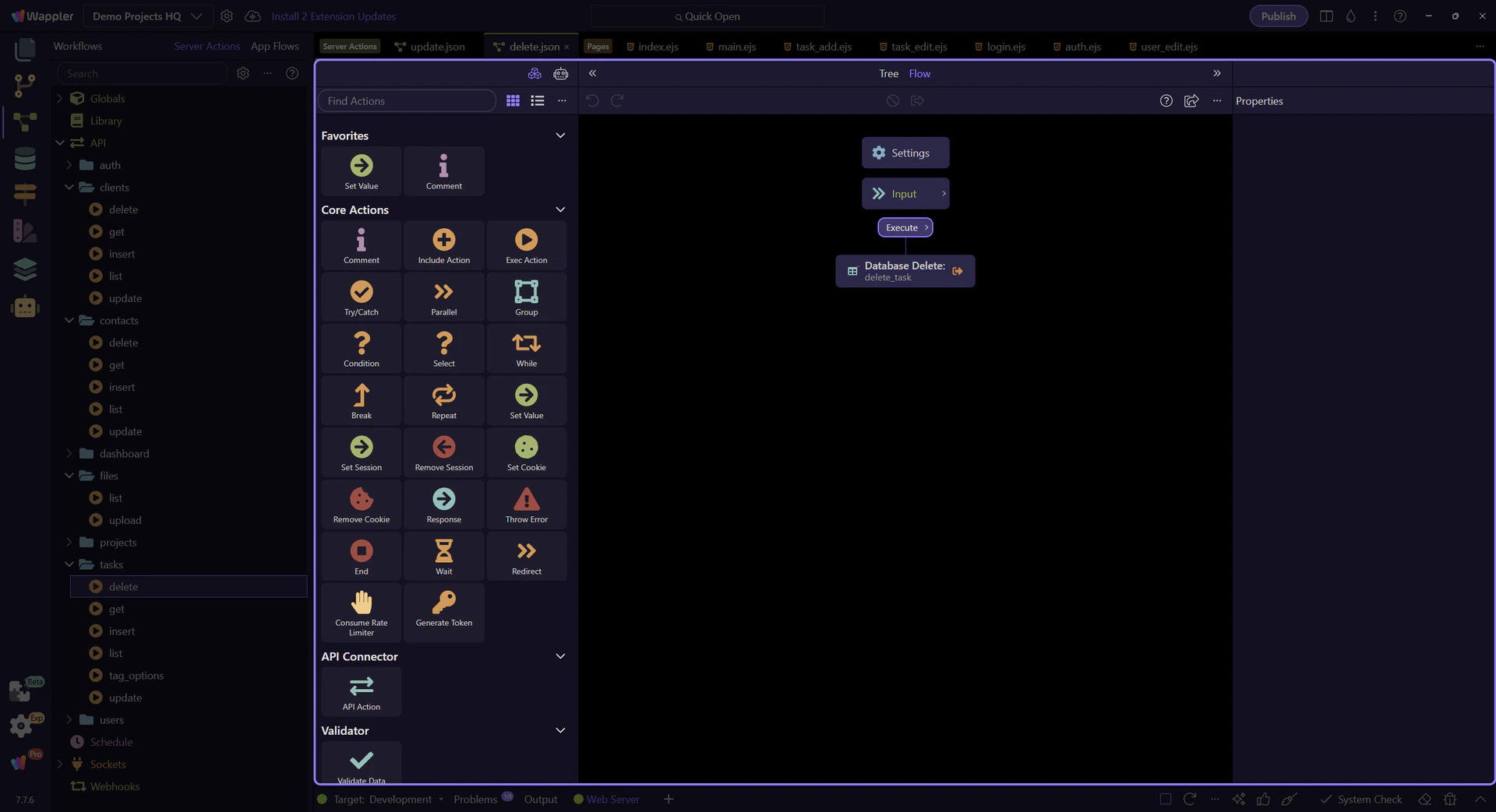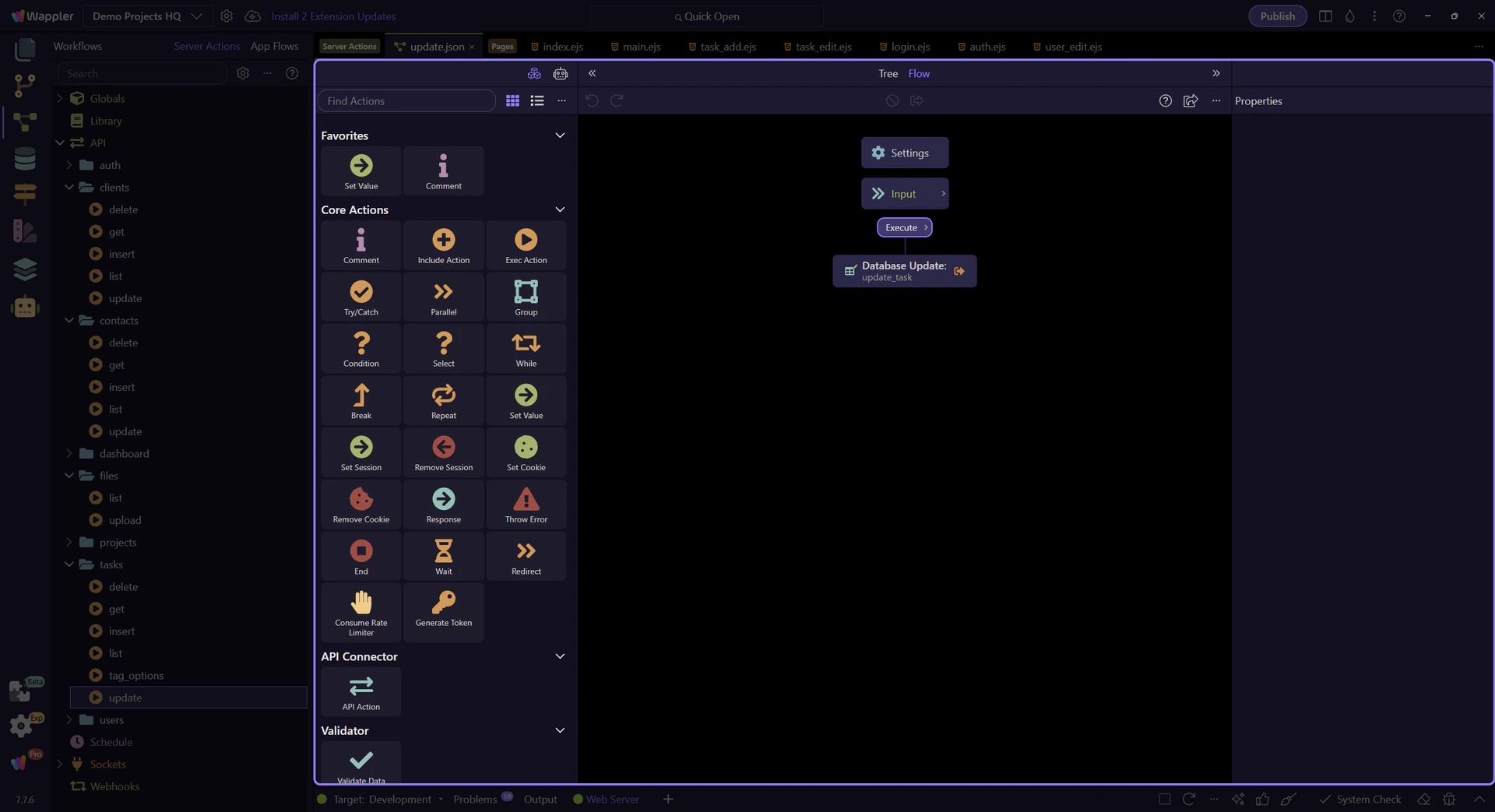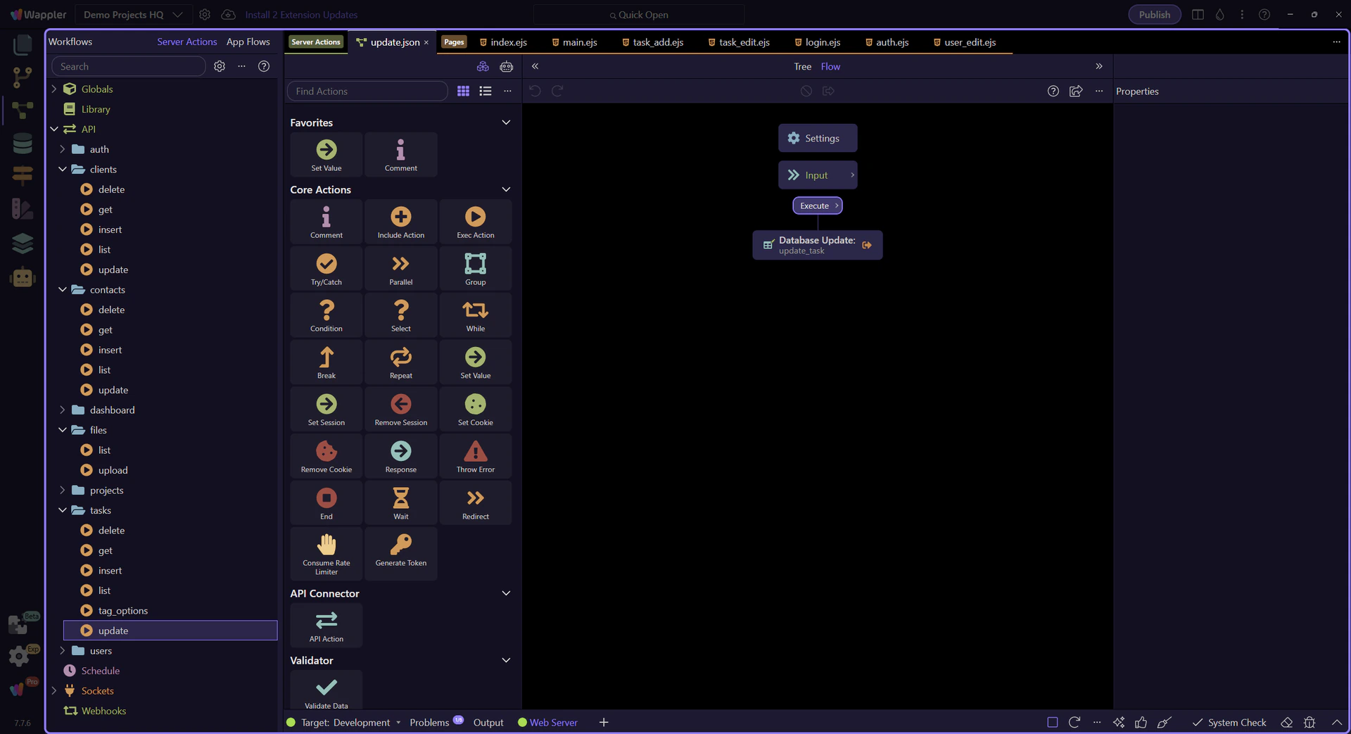 Section titled “The update step is selected in the workflow tree”update_task is the step that turns the accepted form values into column updates on projects_tasks. Selecting it makes the database-oriented properties visible instead of leaving the workflow as a black box.
