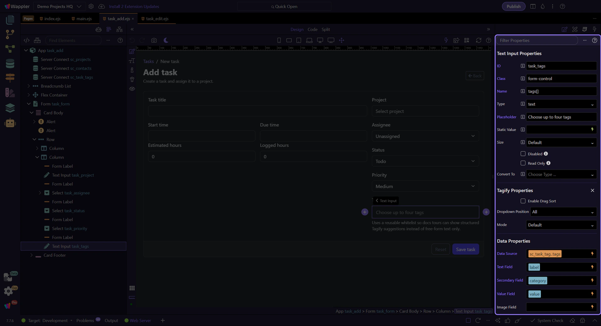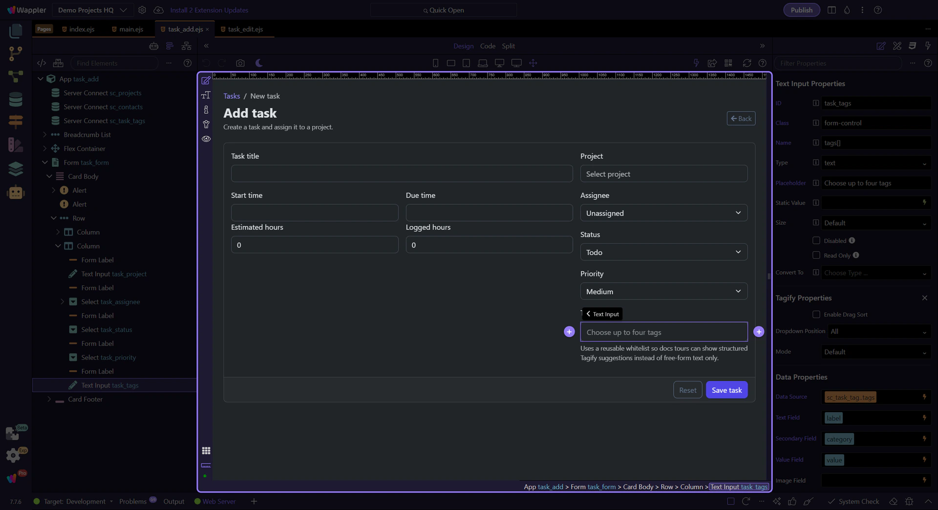 Section titled “Introduction”In Demo Projects HQ, the Tags field on the task form is a real Tagify implementation, not a placeholder demo. It uses a curated data source, posts as tags[], and renders suggestion rows with a primary label plus a secondary category. This tour stays on that concrete field so you can connect what you see in Design View to the properties that shape selection, storage, and visual feedback.