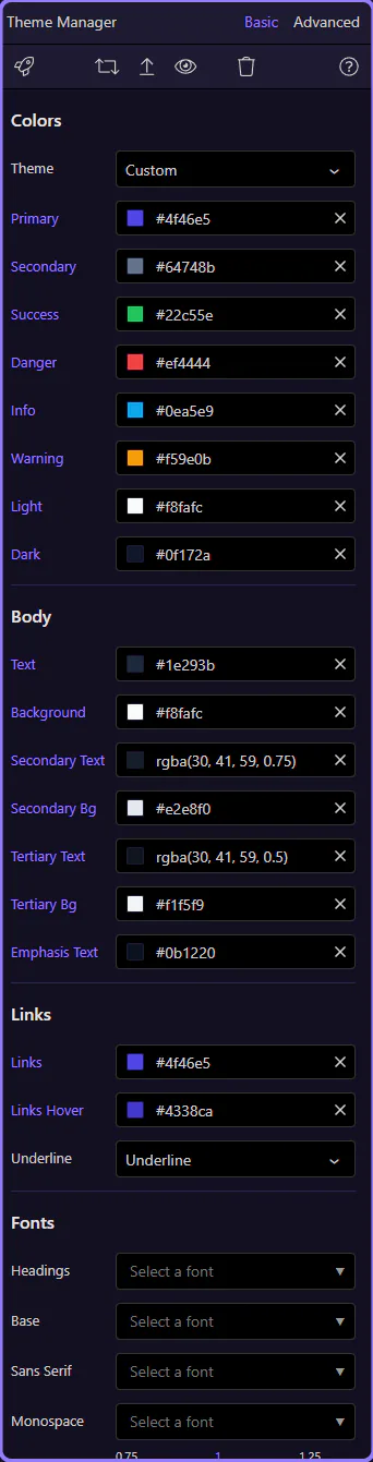 Section titled “Theme Manager (Advanced)”Advanced mode exposes a larger set of variables. First orient yourself in Theme Manager, then switch to Advanced, preview the result, and build or upload when ready.