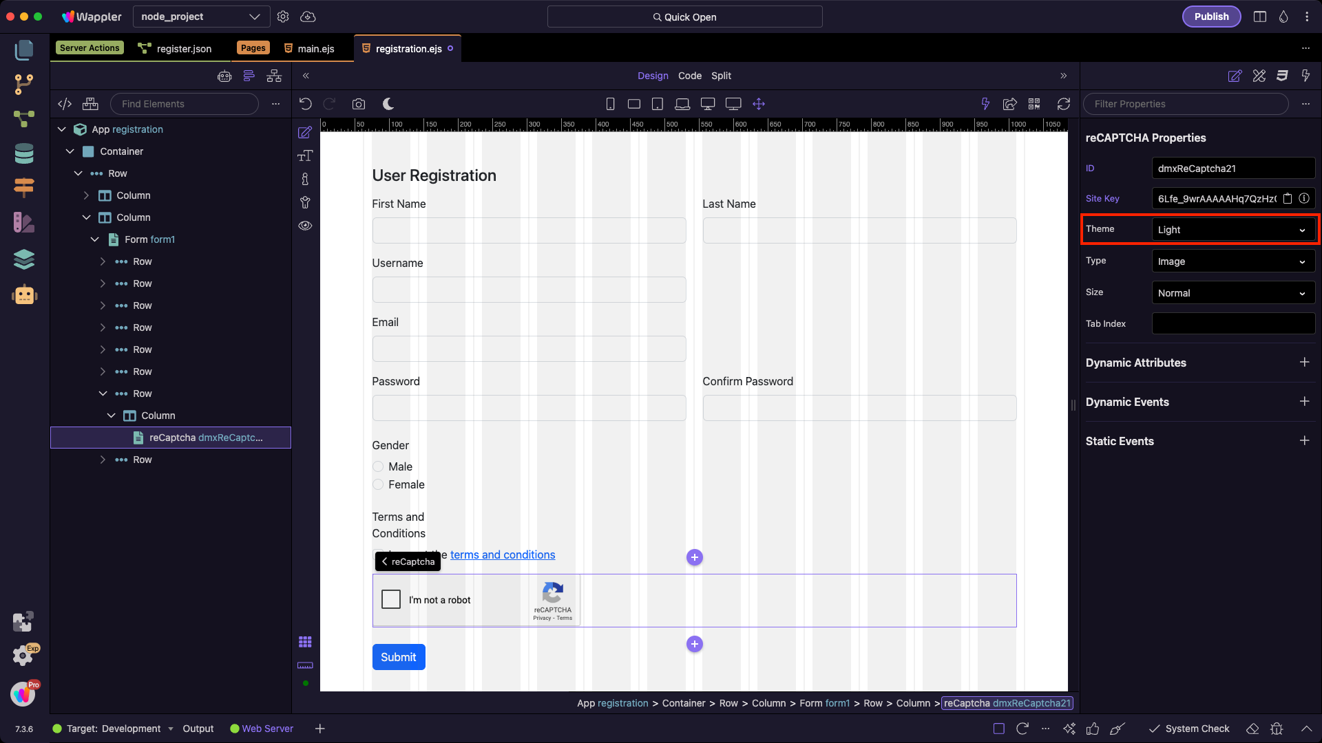 Before adding reCAPTCHA in Wappler, you need a Site Key and a Secret Key from Google.