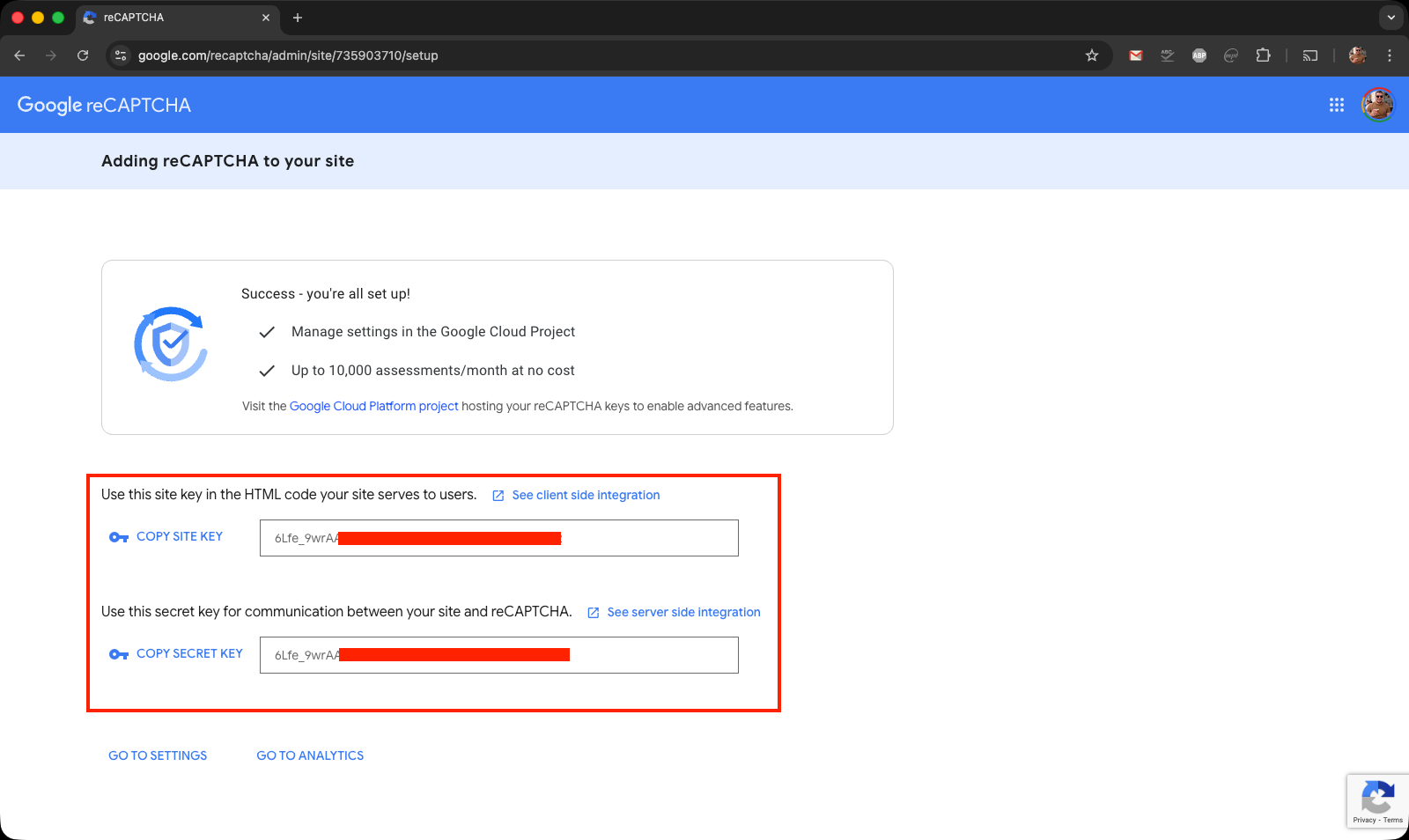 Be sure to use the correct key for the reCAPTCHA type you selected.